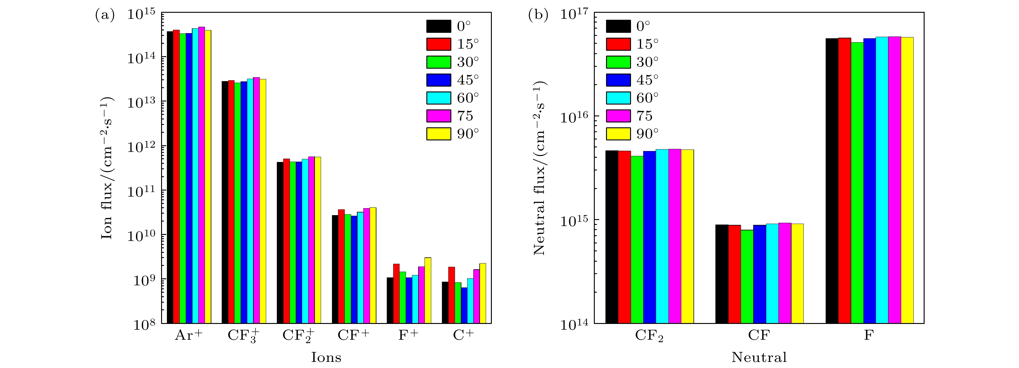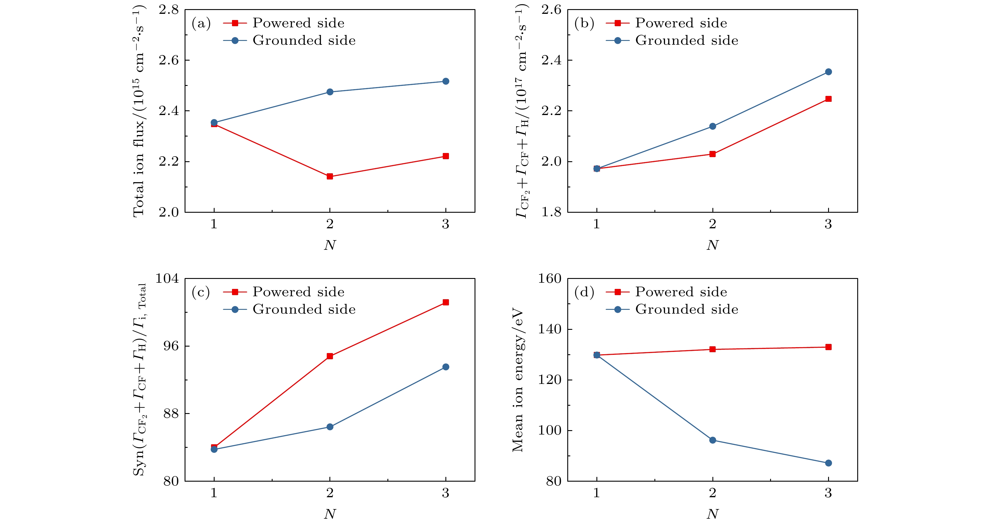 图 14 N = 1, 2, 3 (a) 功率电极与接地电极处的总离子通量; (b) CF2, CF和H通量之和; (c) 中性通量与离子通量比值$ (({\varGamma}_{{\text{CF}}_{2}}+ $$ {\varGamma}_{\text{CF}}+\varGamma_{\text{H}})/{\varGamma}_{{i}, \text{Total}}) $; (d) 平均离子能量[35]