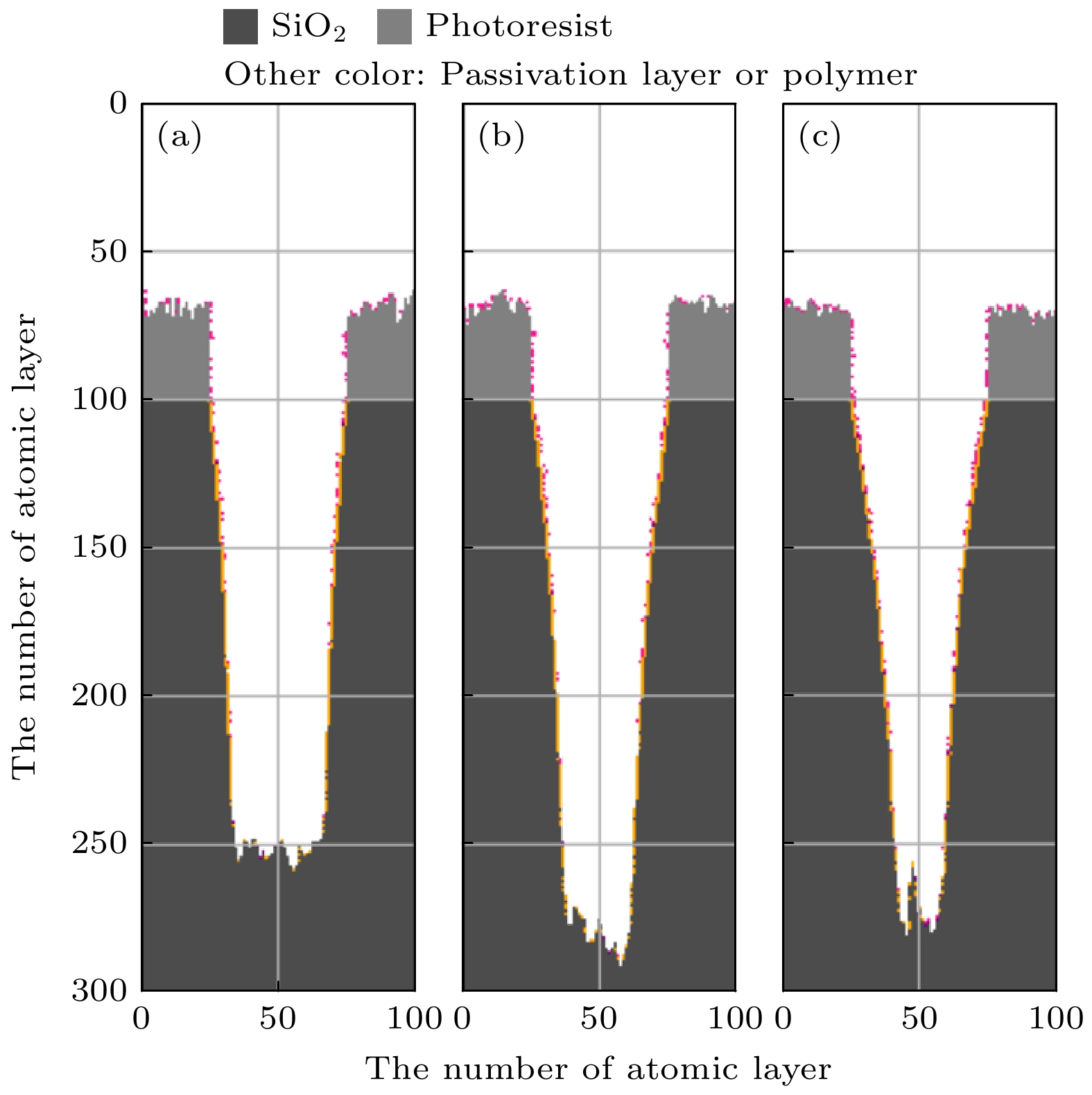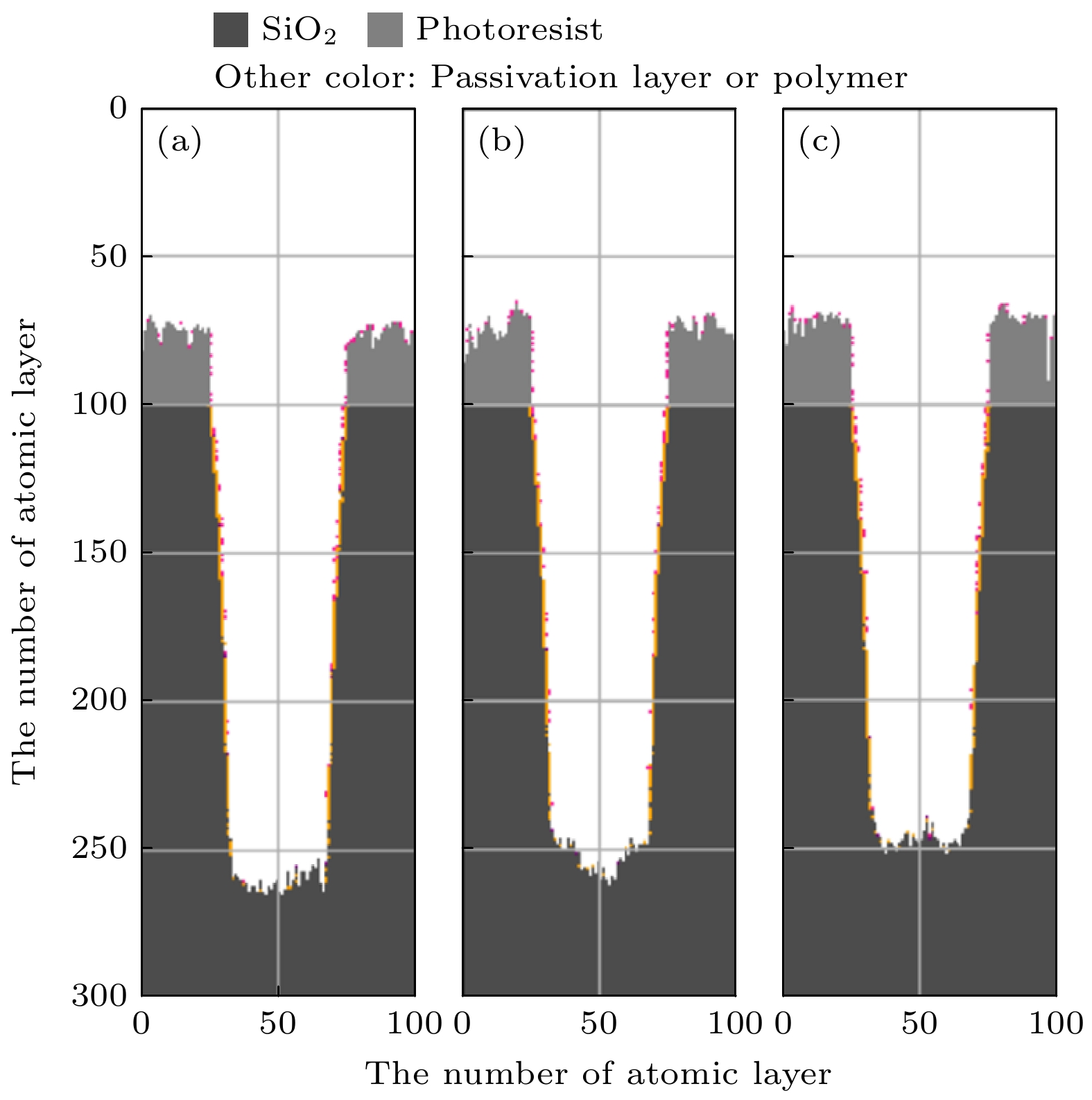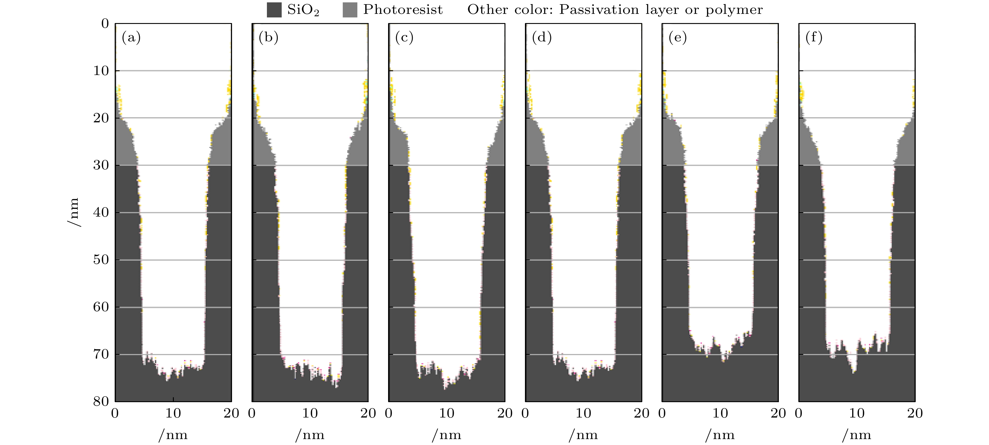 图 13 刻蚀时间为150 s时, 在接地电极处的刻蚀形貌 (a) N = 1, (b) N = 2, (c) N = 3; 在功率电极处的刻蚀形貌 (d) N = 1, (e) N = 2, (f) N = 3; 放电条件与图3相同, 灰色部分为光刻胶, 黑色部分为SiO2, 其余颜色表示材料表面上的聚合物或钝化层[35]