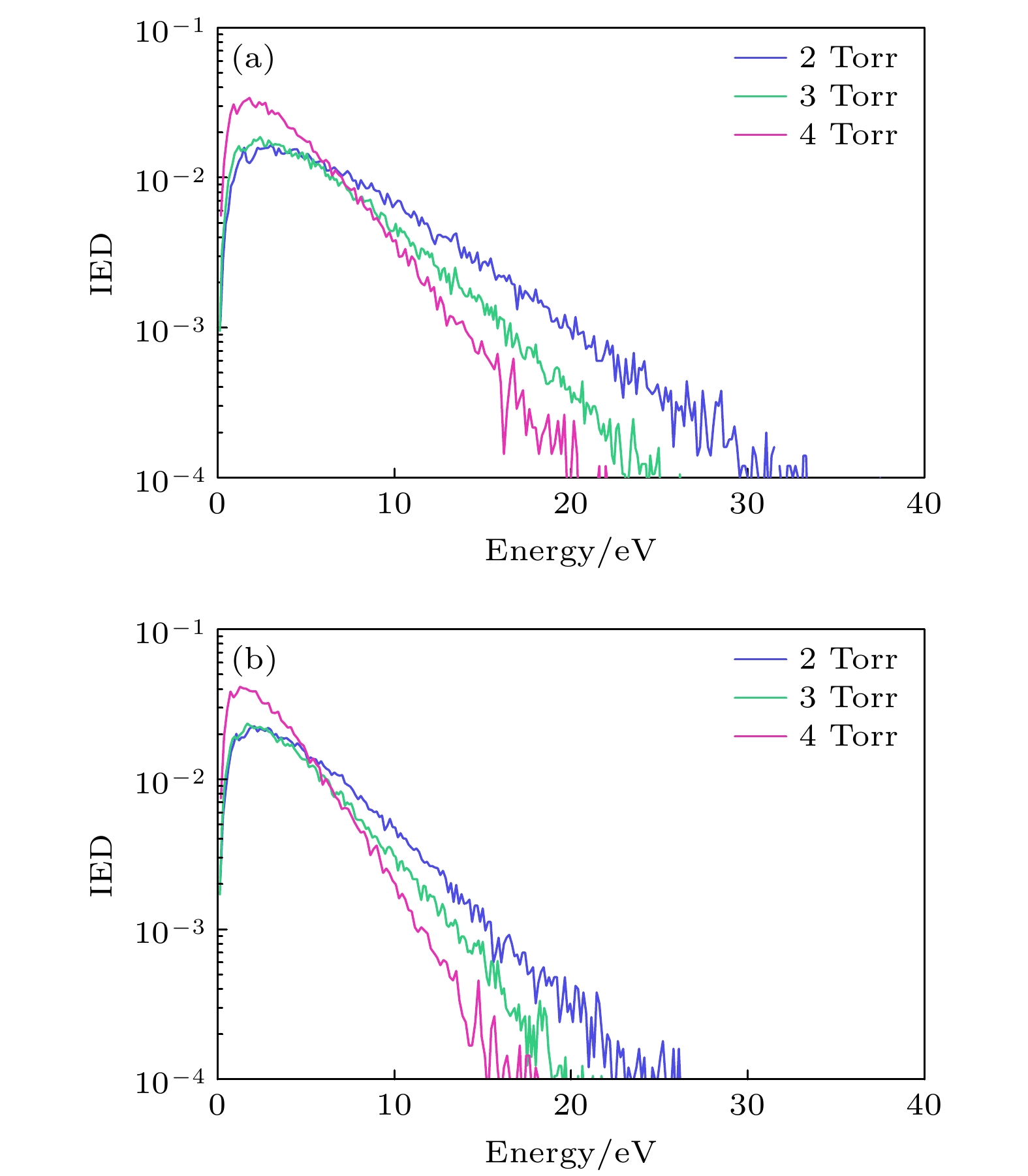 图 3 不同气压(2—4 Torr)下SiH4/H2混合气体放电中的离子能量分布, 放电条件与图1一致 (a) 径向中心处; (b) 电极边缘处接地电极表面