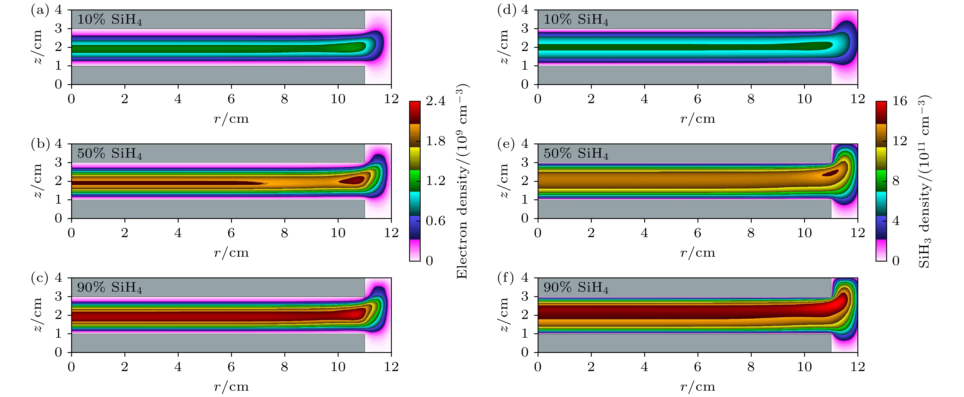 Figure 5. Spatially resolved and RF period-averaged electron density (a)–(c) and SiH3 density (d)–(f) for different SiH4 contents (10%–90%). Discharge condition: Two parallel plates with a length of 11 cm and a distance of 2 cm between them. The frequency used in this work is 13.56 MHz and a voltage amplitude of 50 V. The discharge pressure is 2 Torr.