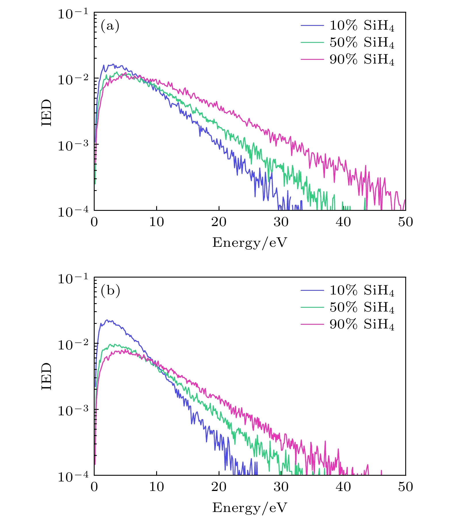 图 7 不同SiH4含量(10%—90%)下SiH4/H2混合气体放电中(a) 径向中心处和(b) 电极边缘处接地电极表面的离子能量分布, 放电条件与图5一致