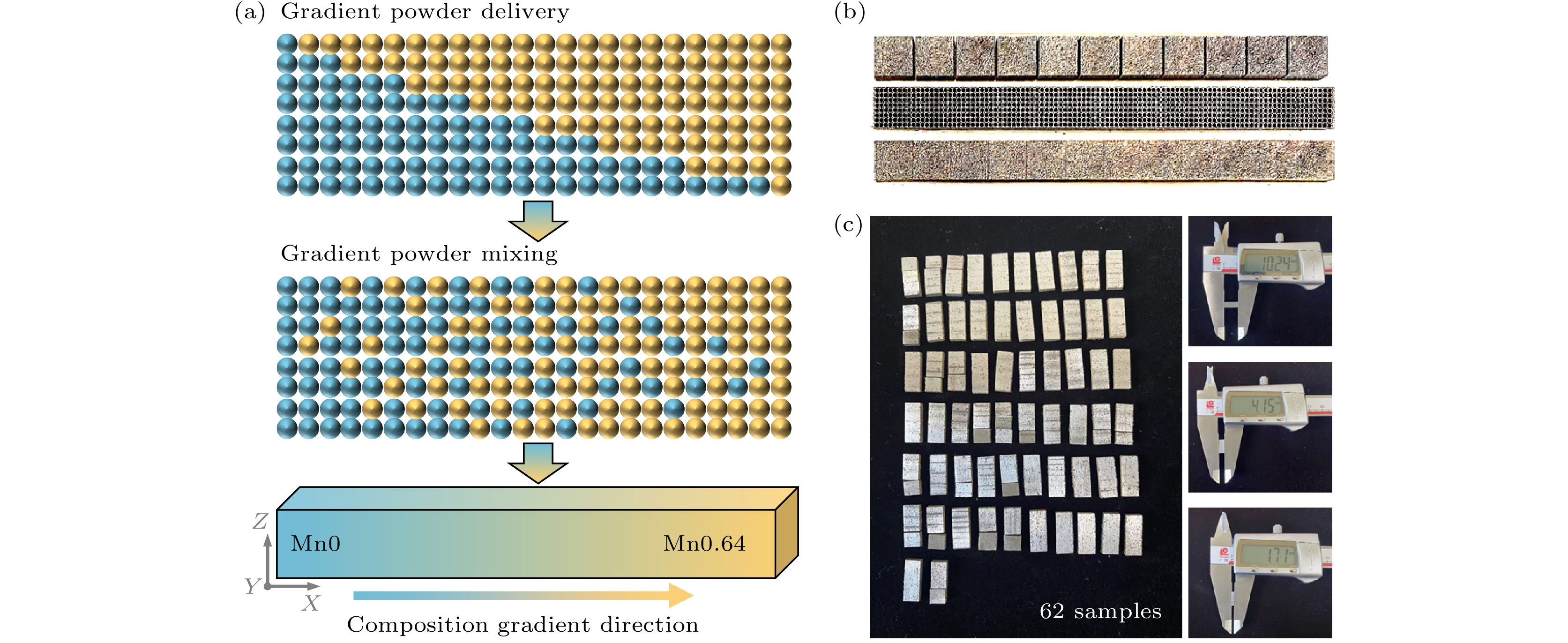 Magnetic refrigeration technology, featuring environmental friendliness, energy efficiency and high performance, is recognized as a next-generation refrigeration technology with the potential to replace gas compression refrigeration technology. However, current magnetic refrigeration materials typically exhibit an excessively narrow phase transition temperature range (≤10 K), thus necessitating the stacking of materials with multiple compositions to meet the practical refrigeration temperature span. In this study, the typical La(Fe, Si)13-based magnetic refrigeration material is selected, and an innovative gradient laser powder bed fusion technology is adopted to obtain 3D-print La0.70Ce0.30Fe11.65–xMnxSi1.35 alloys with horizontal compositional gradients (where the Mn content varies continuously from 0 to 0.64). Systematic characterization of their microstructures, magnetic properties, and magnetocaloric effects indicates that this technology enables a controllable gradient distribution of compositions along the powder bed plane and high-throughput preparation, thereby achieving a continuous variation of the Curie temperature of the gradient alloy over a wide temperature range from 134 K to 174 K. With the increase of Mn content, the phase transition of the alloy gradually changes from a weak first-order phase transition to a second-order phase transition, and the peak shape of the magnetic entropy change curve shifts from “sharp and high” to “broad and flat”. The full width at half maximum of the temperature range is extended to 83.3 K, allowing the gradient alloy to maintain high refrigeration capacity (RC ~130 J/kg, 3 T) at all time. This study breaks through the bottlenecks of traditional material preparation and performance via gradient additive manufacturing, providing a novel technical pathway for achieving high-throughput preparation and performance optimization of magnetic refrigeration materials.