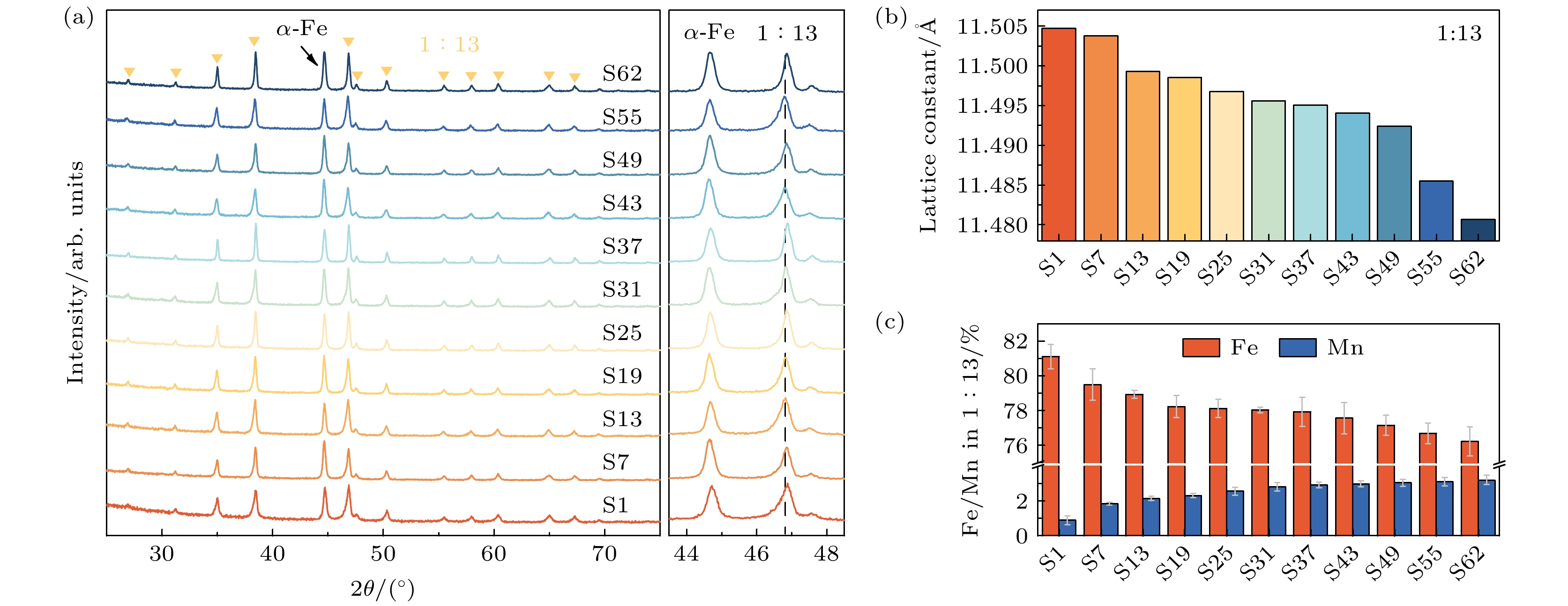 图 3 退火态CGAs的结构和成分演变 (a) XRD图谱; (b) 通过Rietveld精修得到的对应晶格参数; (c) EDS点扫描得到的1:13相Fe和Mn含量