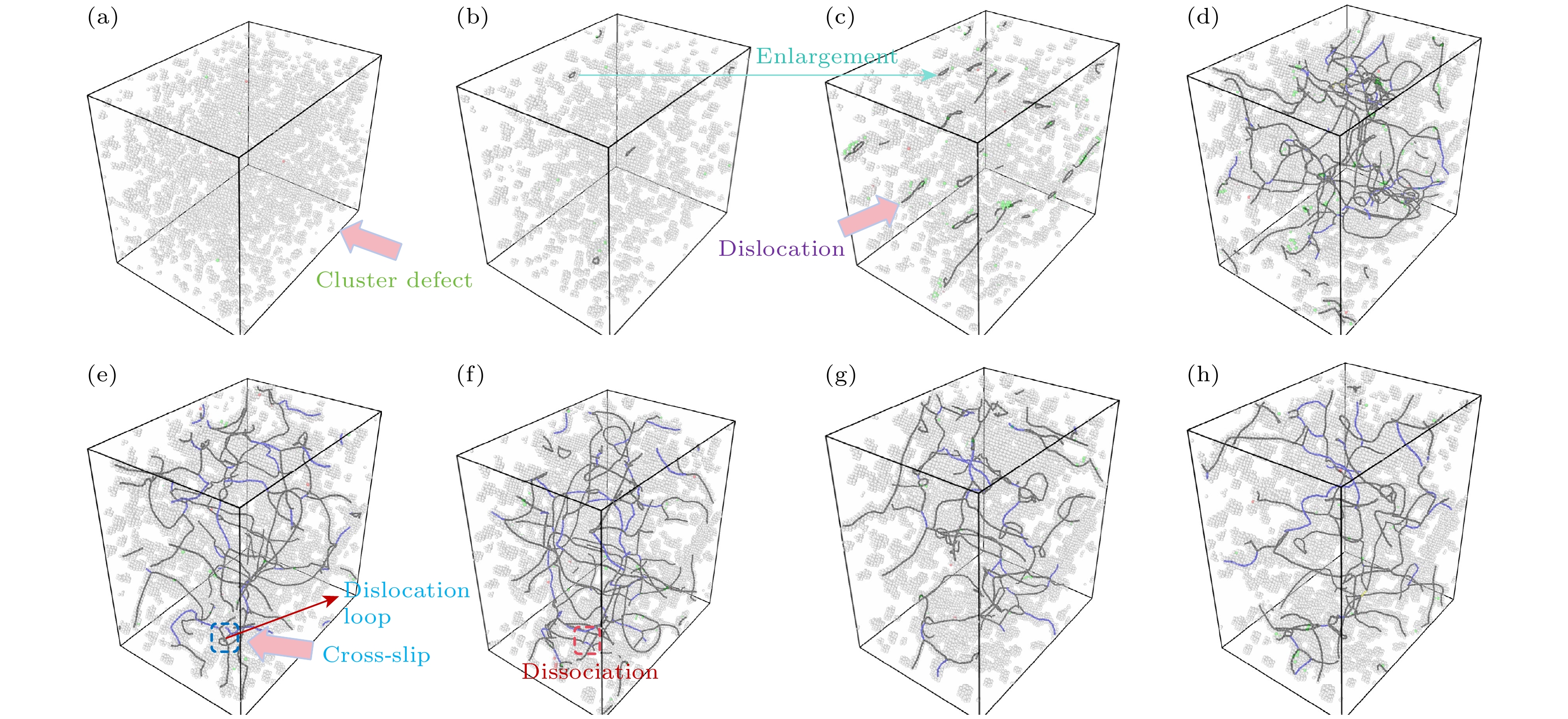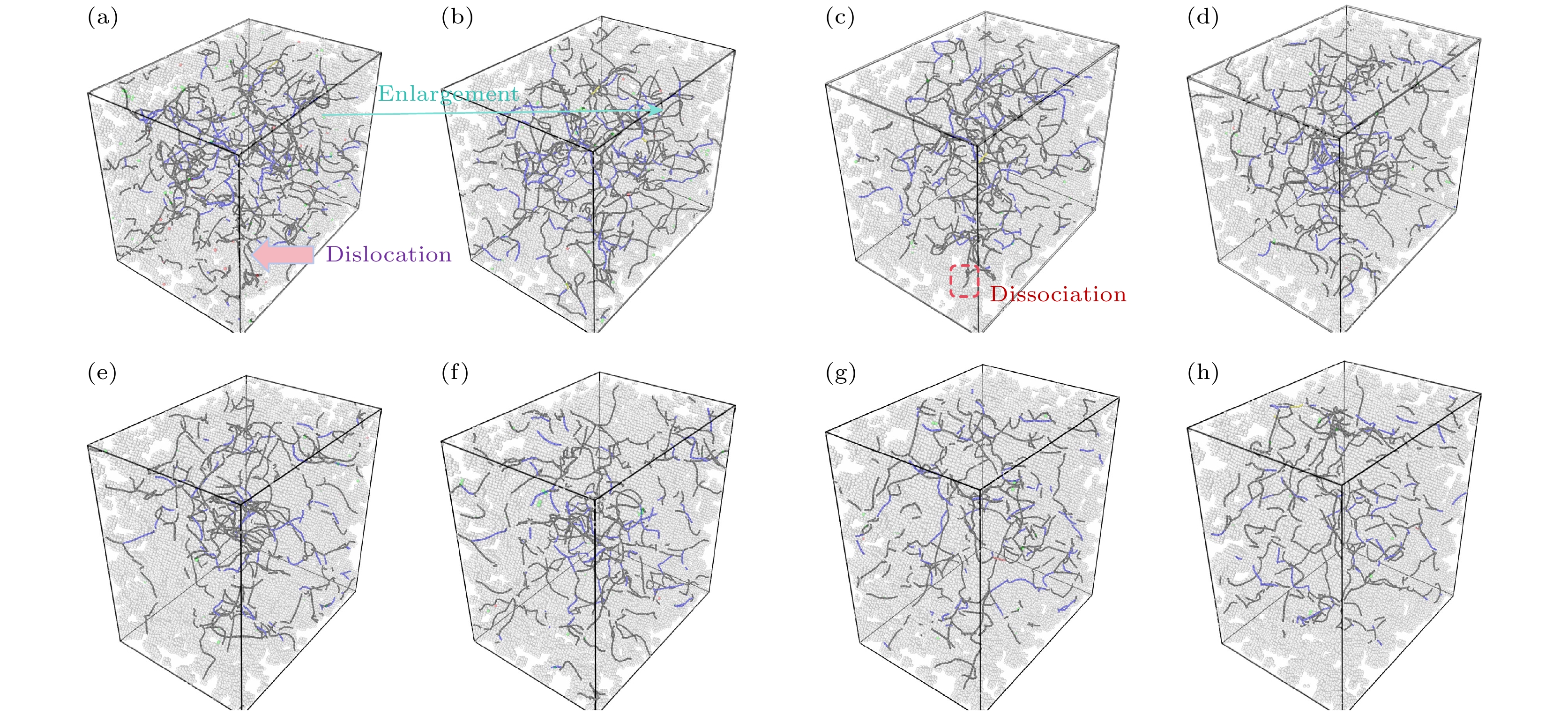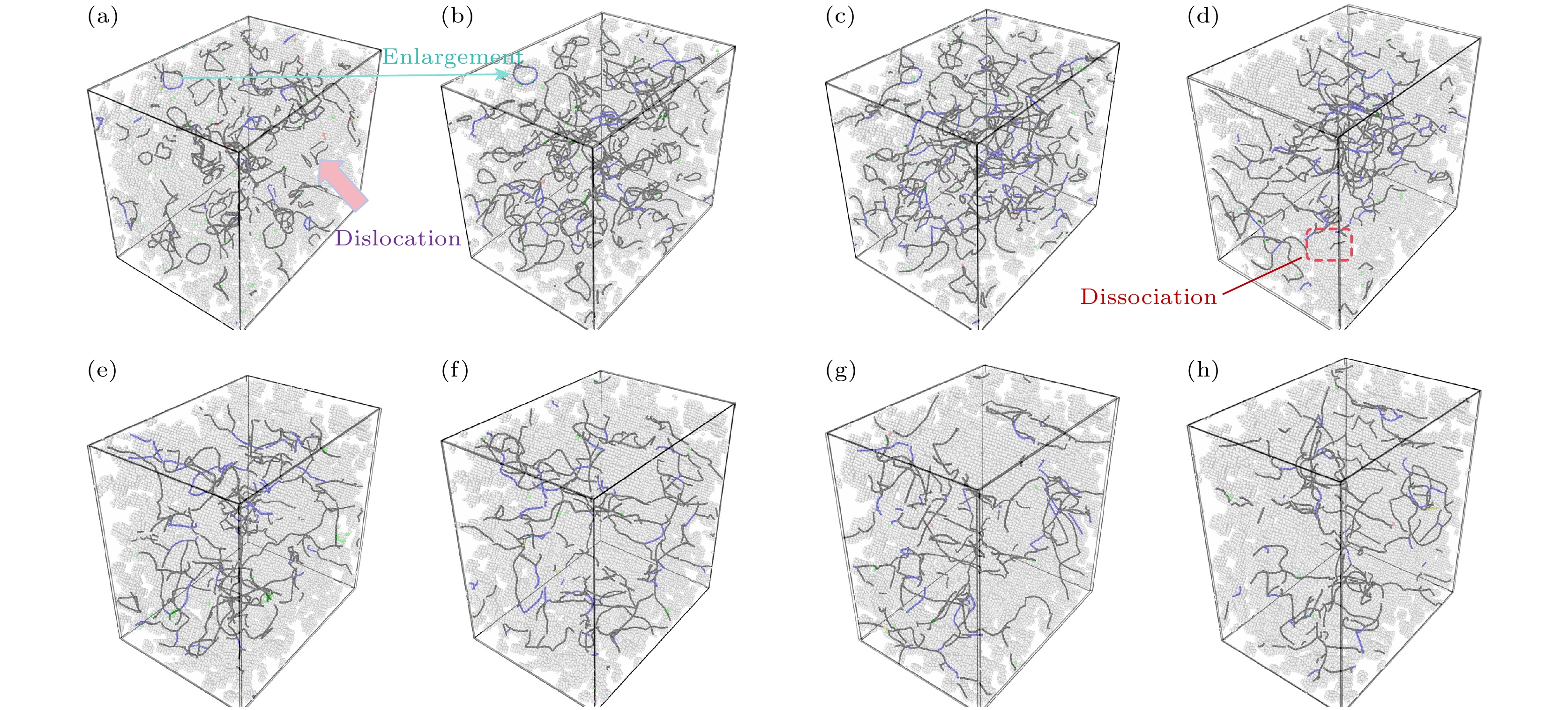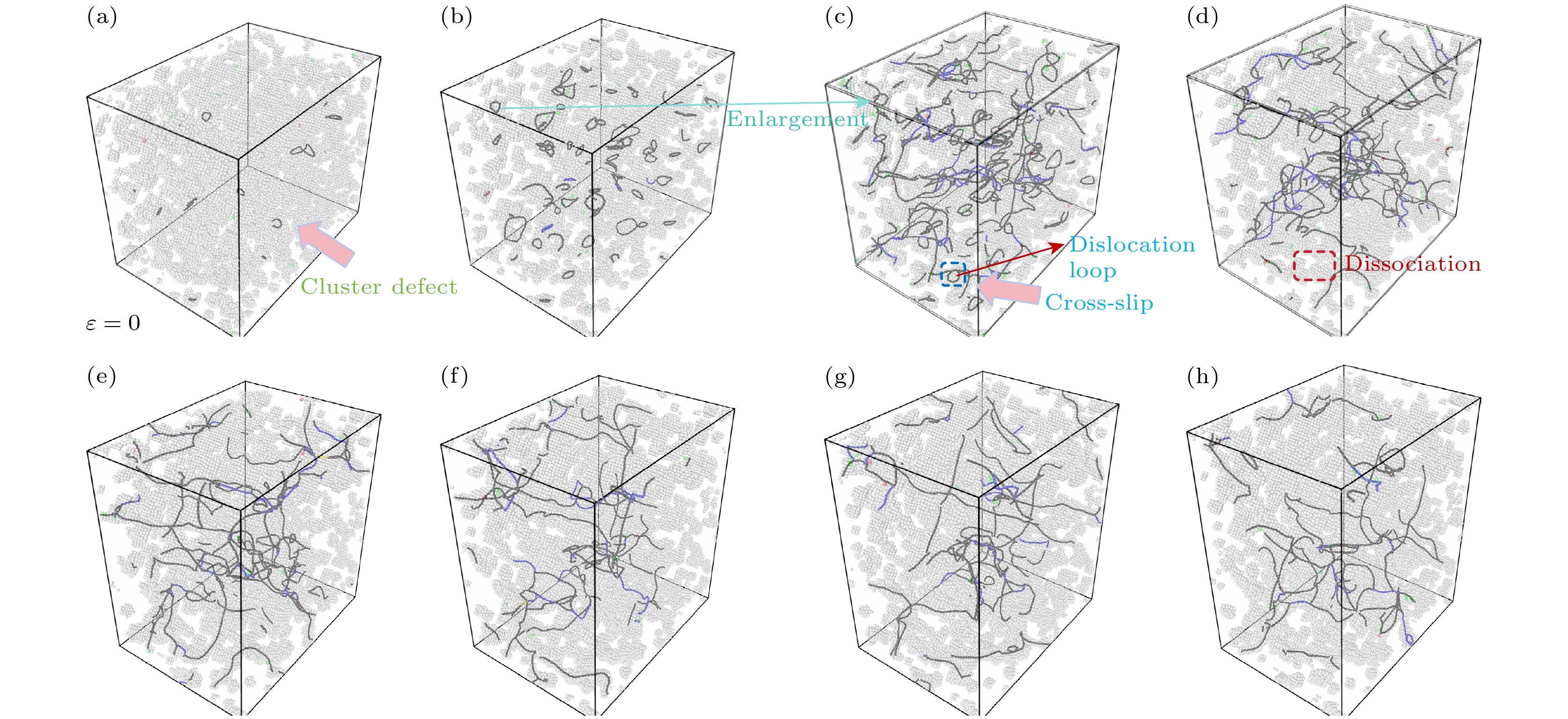 Figure 9. Atomic configuration evolution of single-crystal iron without helium concentration effect during tensile deformation: (a) ε = 0.003; (b) ε = 0.054; (c) ε = 0.108; (d) ε = 0.12; (e) ε = 0.135; (f) ε = 0.165; (g) ε = 0.189; (h) ε = 0.21; gray-white atoms denote “other”, green denotes “fcc”; lines are dislocation lines, black denotes “1/2$ \left\langle {111} \right\rangle $”, blue denotes “$ \left\langle {100} \right\rangle $”, and yellow denotes “$ \left\langle {110} \right\rangle $”.