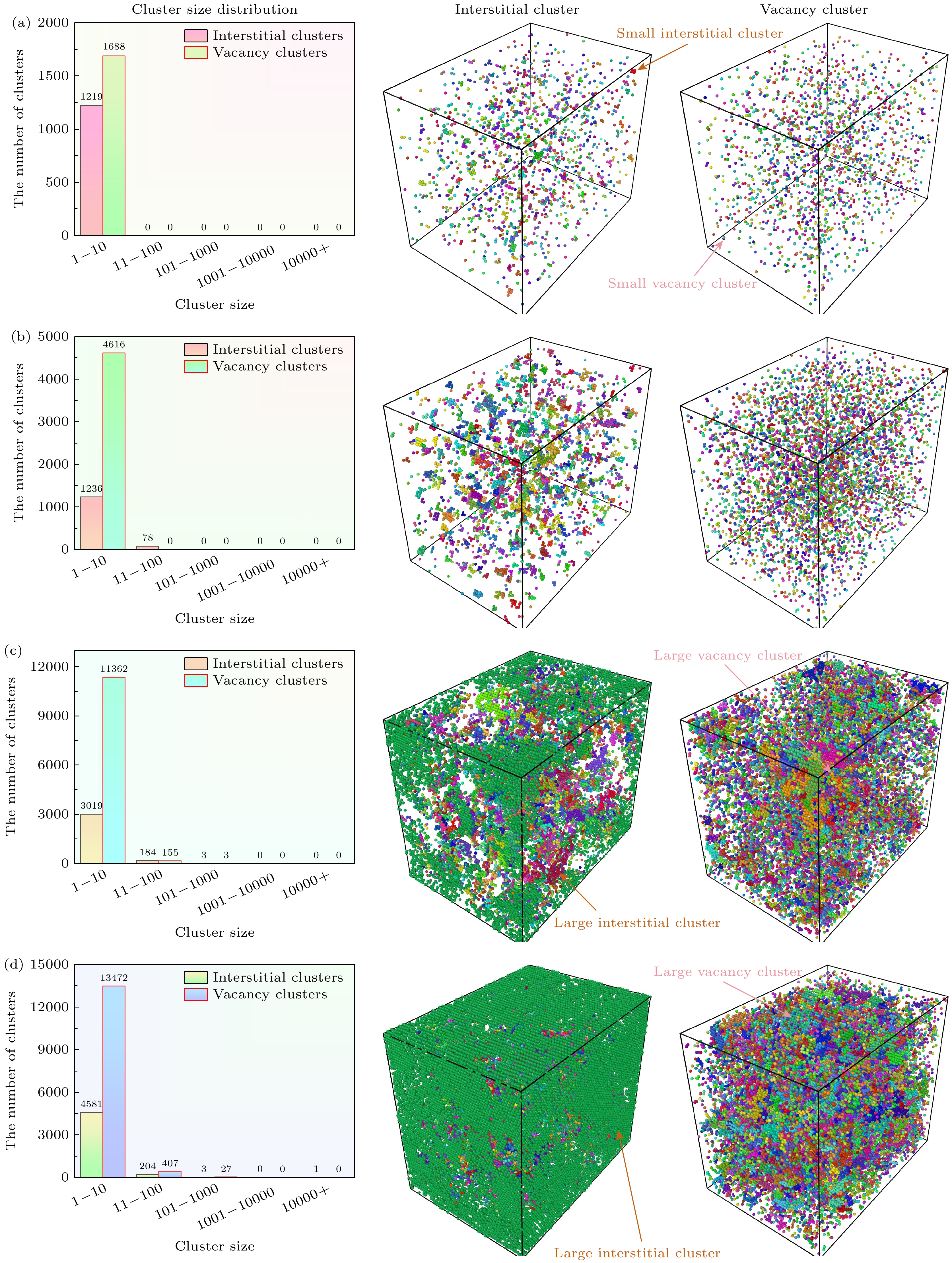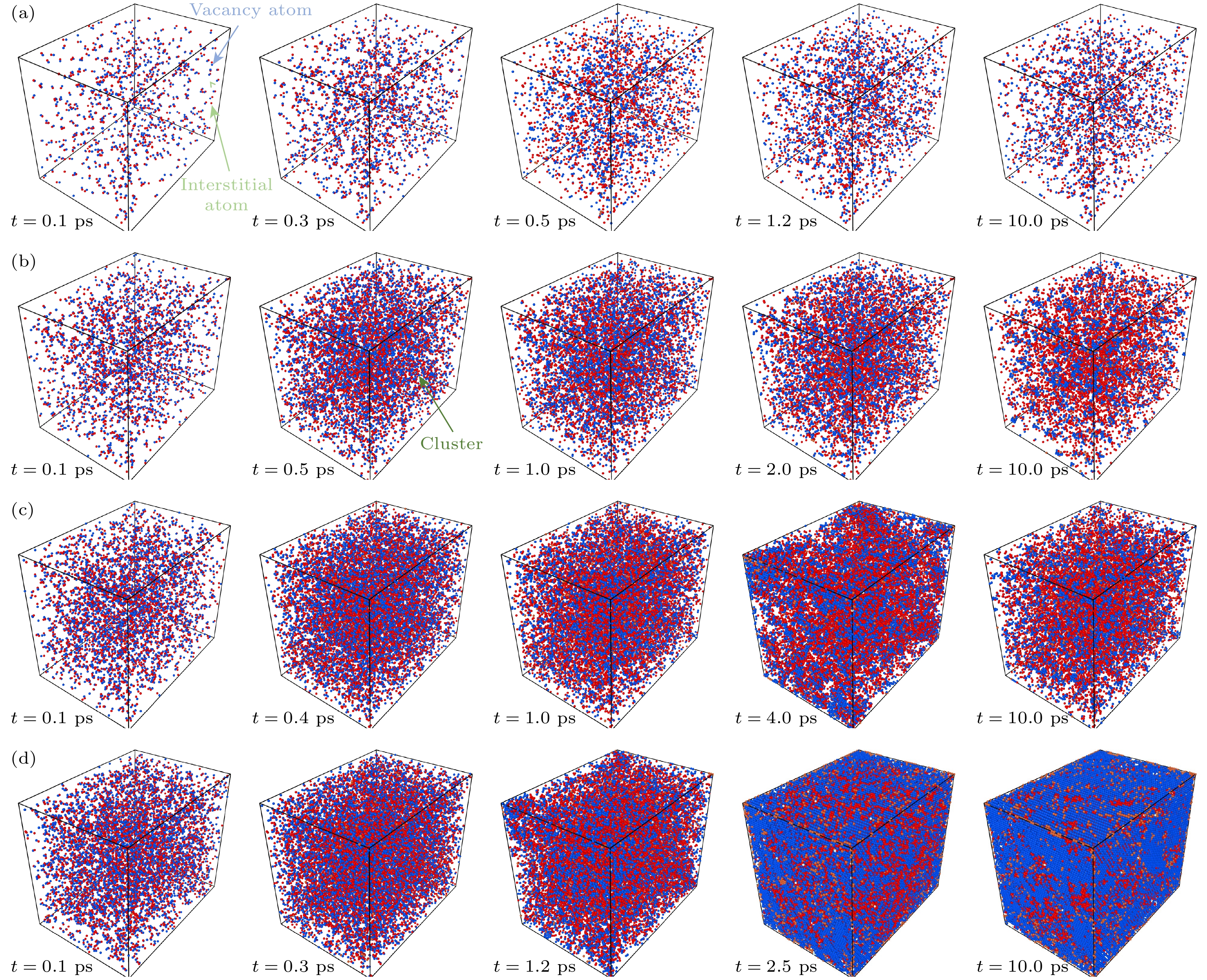 Figure 2. Defect evolution processes in single-crystal iron with different helium concentrations: (a) NHe = 0.5%; (b) NHe = 1.5%; (c) NHe = 3.0%; (d) NHe = 4.5%. Red spheres represent vacancies, and blue spheres represent interstitial atoms.