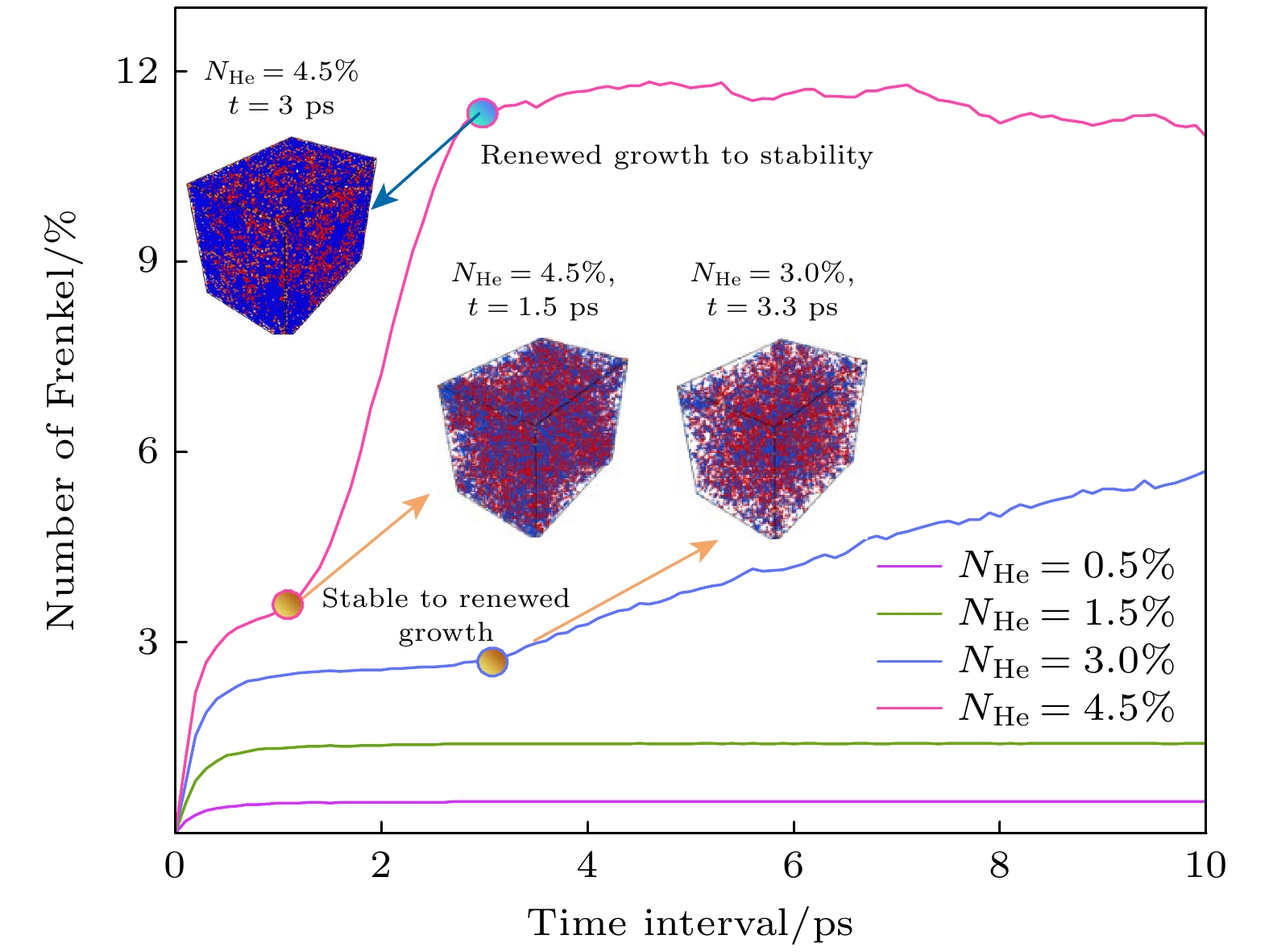 图 2 不同氦浓度单晶铁中缺陷演化过程 (a) NHe = 0.5%; (b) NHe = 1.5%; (c) NHe = 3.0%; (d) NHe = 4.5%. 红色小球代表空位, 蓝色小球代表间隙原子