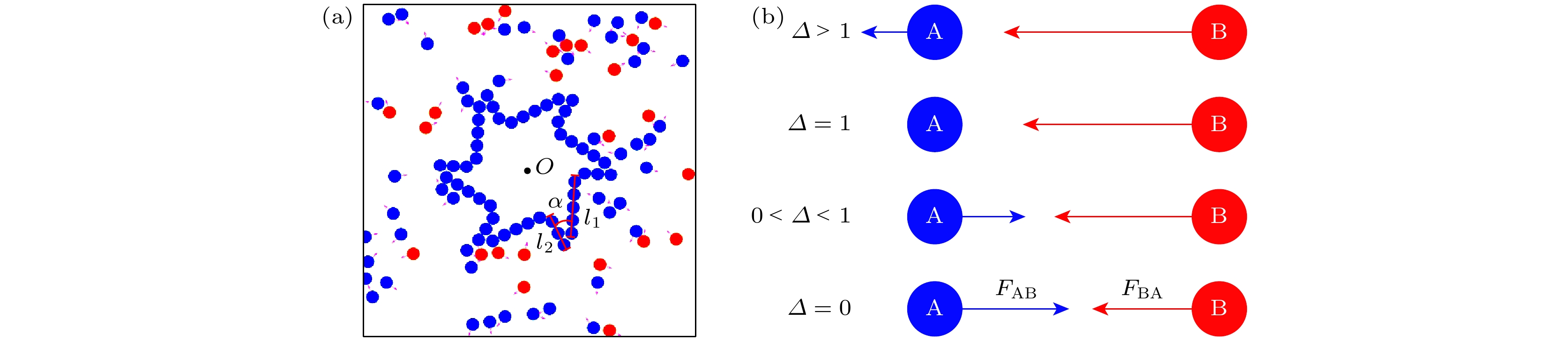 图 1 粒子-齿轮模型示意图以及非互易相互作用示意图 (a) 在具有周期性边界条件的二维箱中, 由非互易粒子(红色和蓝色圆盘)驱动的齿轮示意图; (b) 粒子A与B在不同$ {\varDelta } $值下的成对非互易相互作用示意图