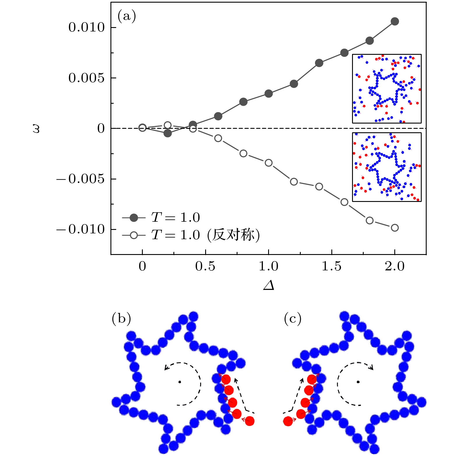 Figure 2. Dependence of the average angular velocity $ \omega $ on the non-reciprocal interaction strength $ {\varDelta } $: (a) The average angular velocity $ \omega $ as a function of the non-reciprocal interaction strength $ {\varDelta } $ for two chirally symmetric gears at $ T=1.0 $ and $ \phi =0.1 $; (b) mechanism of counterclockwise rotation in the gear; (c) mechanism of clockwise rotation in the antisymmetric gear.