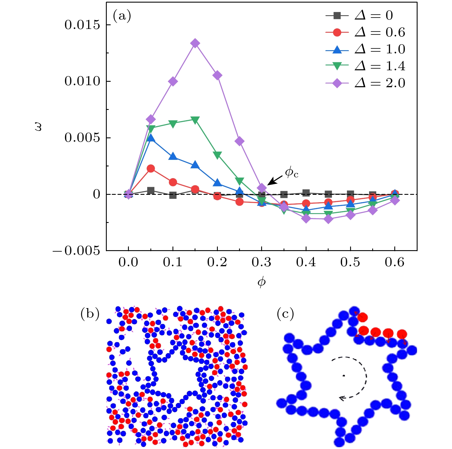 Figure 3. Dependence of the average angular velocity $ \omega $ on the packing fraction $ \phi $ for different non-reciprocal interaction strengths $ {\varDelta } $: (a) The average angular velocity $ \omega $ as a function of the packing fraction $ \phi $ for different $ {\varDelta } $ at $ T=1.0 $; (b) simulation snapshot at $ T=1.0 $, $ \phi =0.4 $ and $ {\varDelta }=2.0 $; (c) schematic of the density-induced clockwise rotation of the gear.