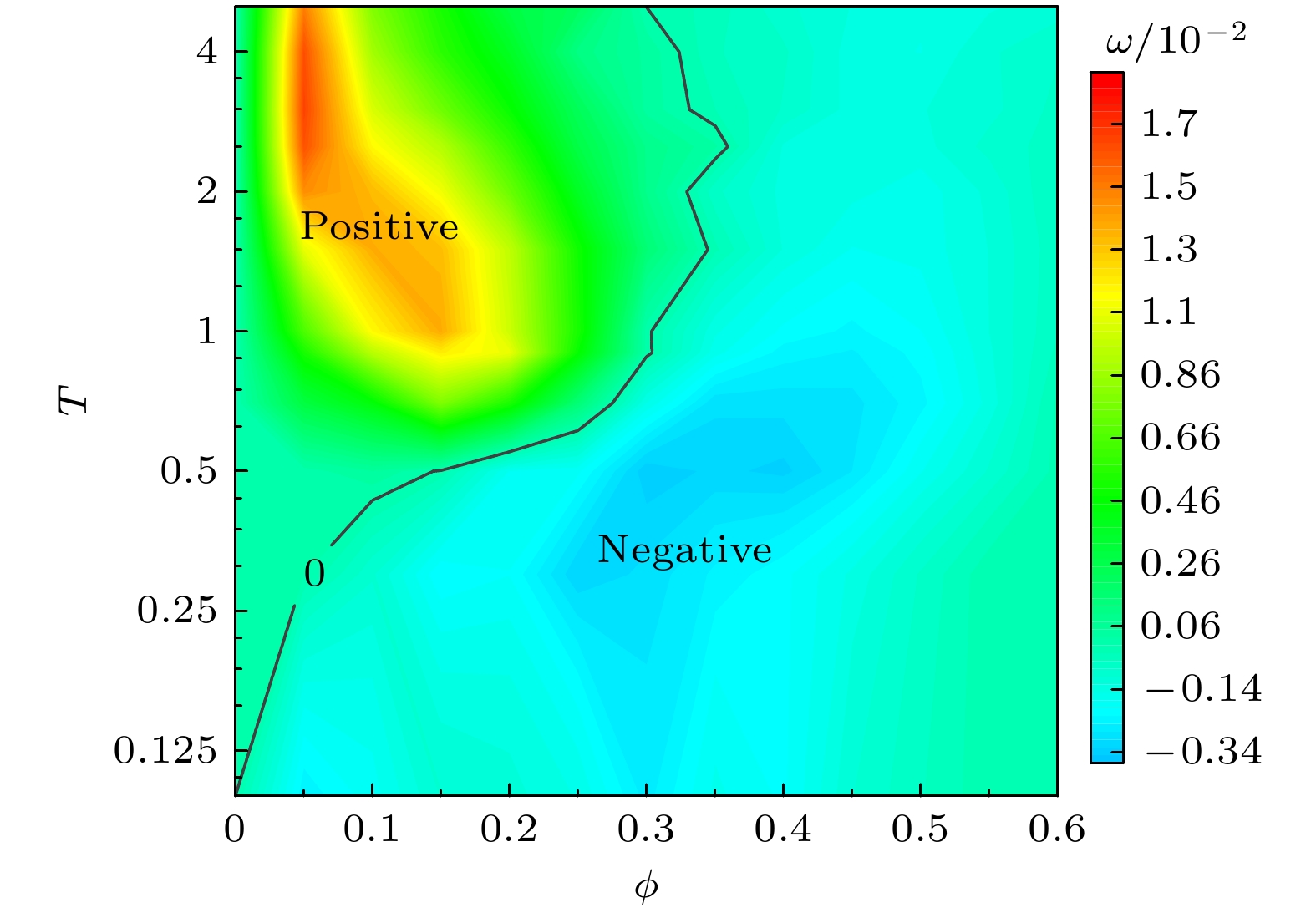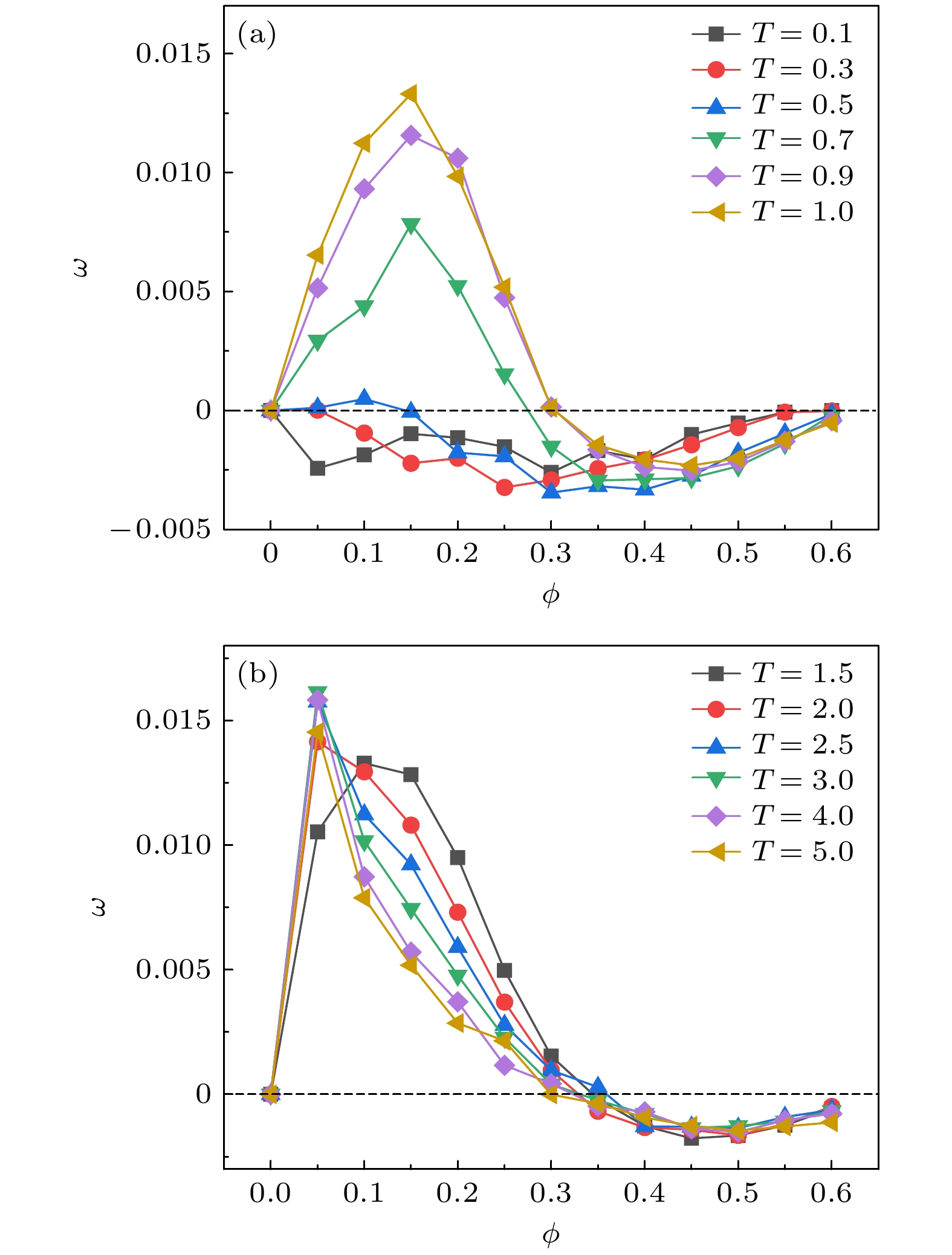 图 6 不同非互易强度$ {\varDelta } $下齿轮平均角速度$ \omega $随温度$ T $的变化关系 (a) 在填充分数$ \phi =0.1 $时, 不同$ {\varDelta } $下$ \omega $随$ T $的变化关系; (b) 在$ T=0.1 $, $ \phi =0.1 $, $ {\varDelta }=2.0 $条件下的模拟快照