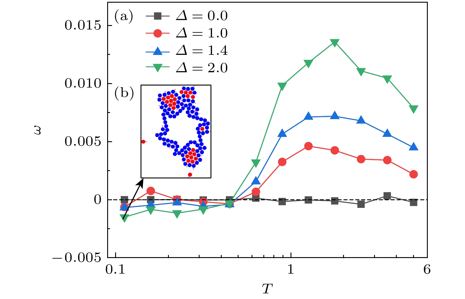 Figure 6. Dependence of the average angular velocity $ \omega $ on the temperature $ T $ for different non-reciprocal interaction strengths $ {\varDelta } $: (a) The average angular velocity $ \omega $ as a function of the temperature $ T $ for different $ {\varDelta } $ at $ \phi =0.1 $; (b) simulation snapshot at $ T=0.1 $ and $ {\varDelta }=2.0 $.