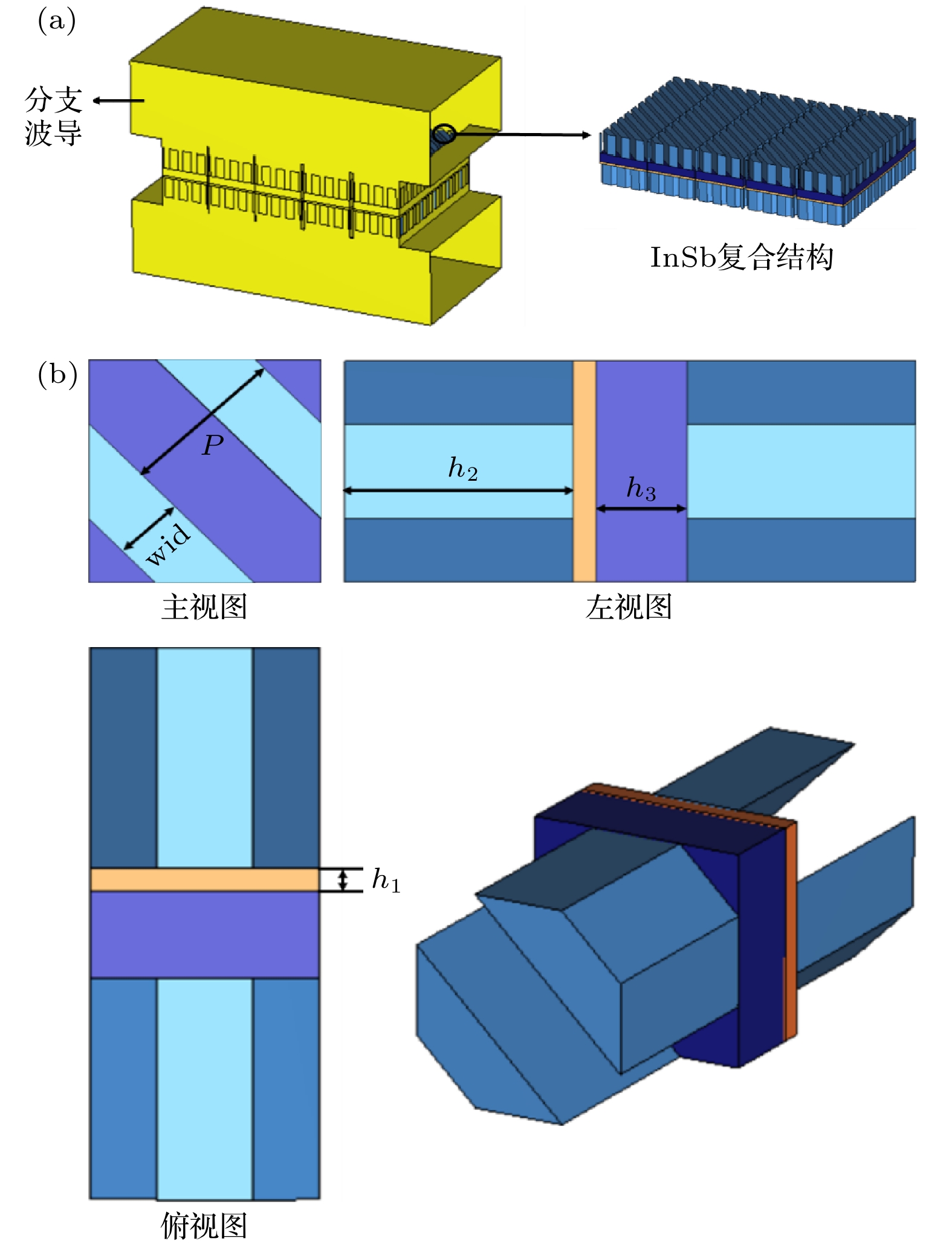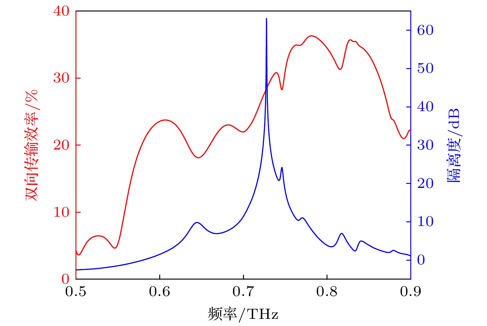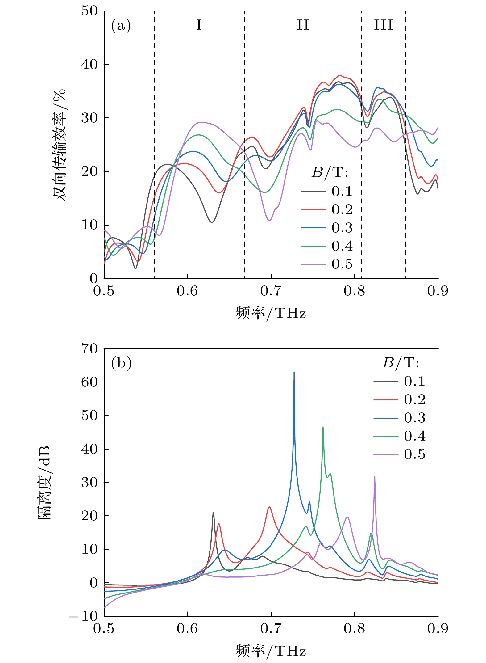 结构参数 结构尺寸/μm InSb层高度h1 5 光栅层高度h2 50 衬底层高度h3 20 光栅周期p 25 光栅条宽度wid 15 中心分支的高度比例因子b 0.618 两端分支的高度比例因子a 0.618 分支的长度h0 170 相邻分支中心间距j1a1b 125 相邻分支中心间距j1b2b 125 相邻分支中心间距j2b3b 120 相邻分支中心间距j3b2a 120 表 3 现有太赫兹隔离器性能对比