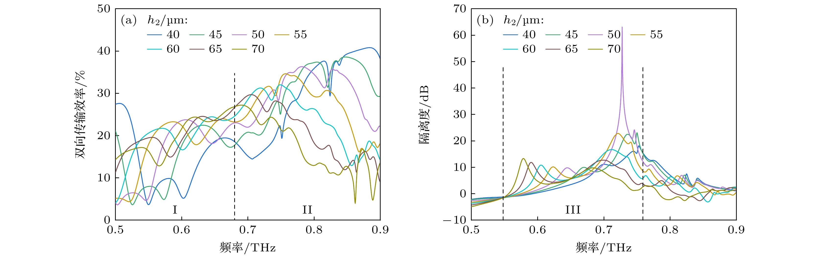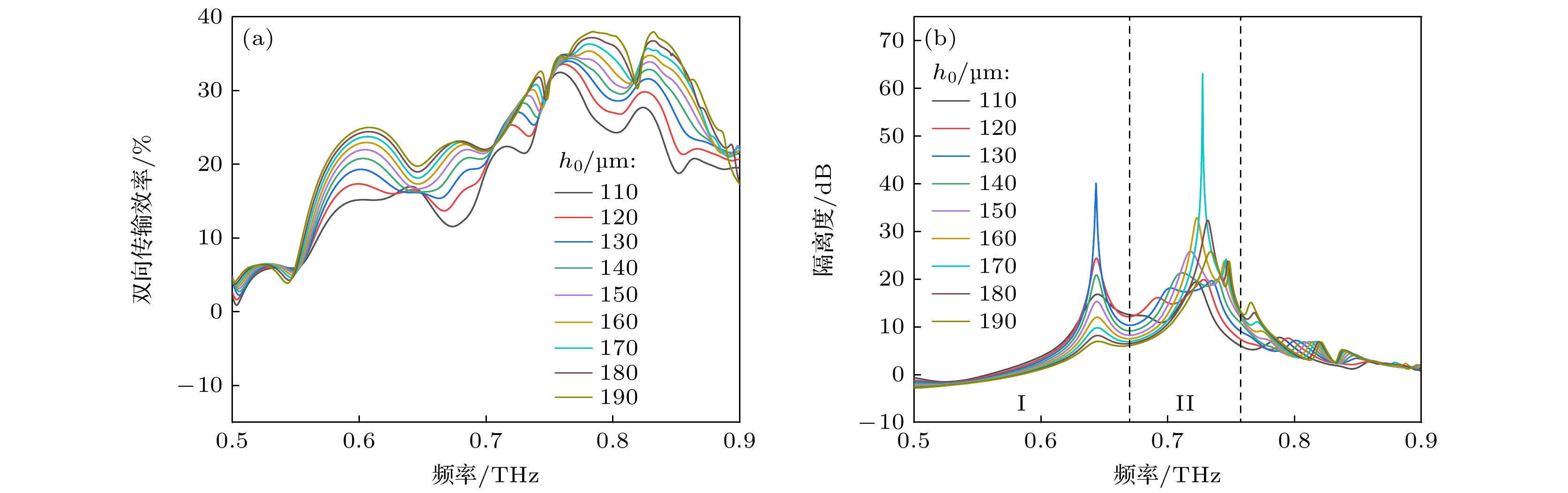 图 5 InSb层高度$ {h}_{1} $对器件性能的影响 (a) $ {h}_{1} $小于等于5 μm时双向传输效率变化关系; (b) $ {h}_{1} $大于5 μm时双向传输效率变化关系; (c) 隔离度变化关系