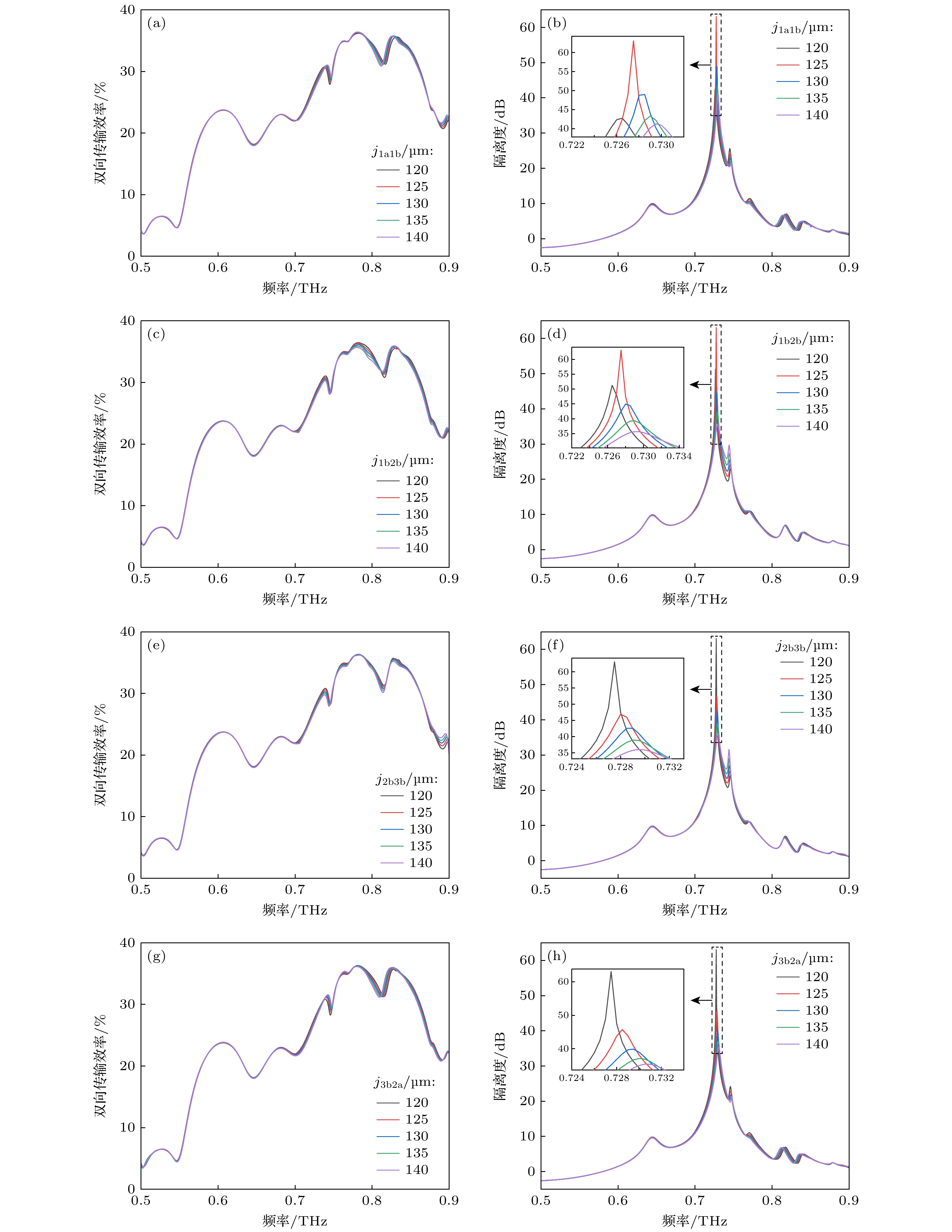 图 4 相邻分支中心间距j1a1b, j1b2b, j2b3b, j3b2a与双向传输效率、隔离度的关系图 (a) j1a1b与双向传输效率的关系图; (b) j1a1b与隔离度的关系图; (c) j1b2b与双向传输效率的关系图; (d) j1b2b与隔离度的关系图; (e) j2b3b与双向传输效率的关系图; (f) j2b3b与隔离度的关系图; (g) j3b2a与双向传输效率的关系图; (h) j3b2a与隔离度的关系图