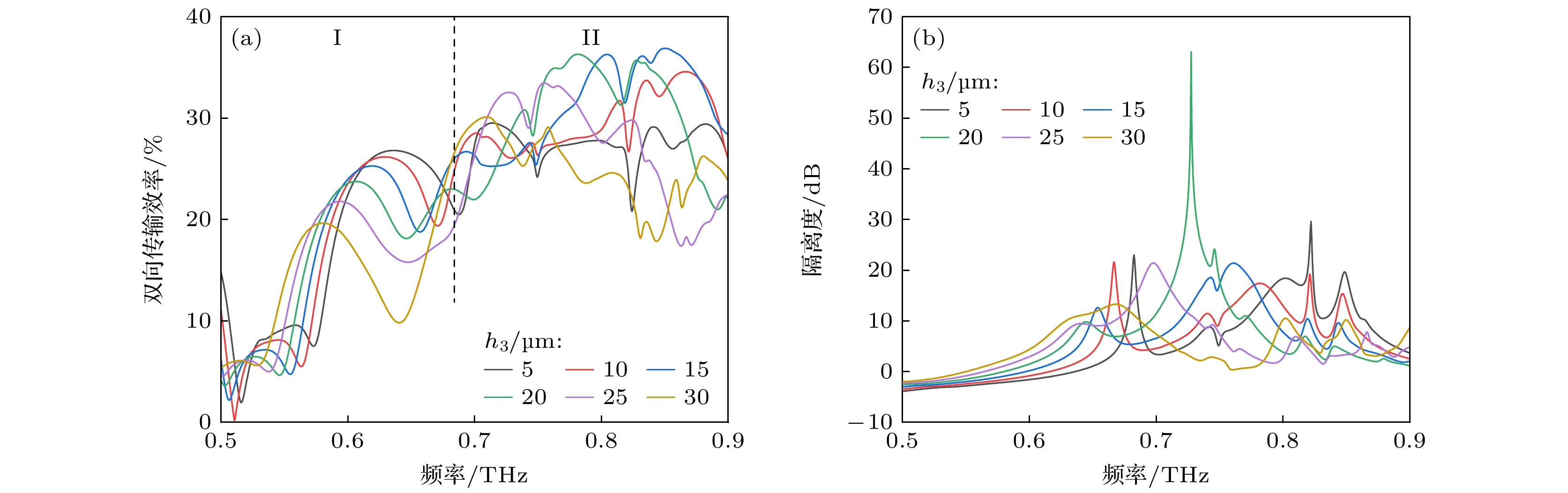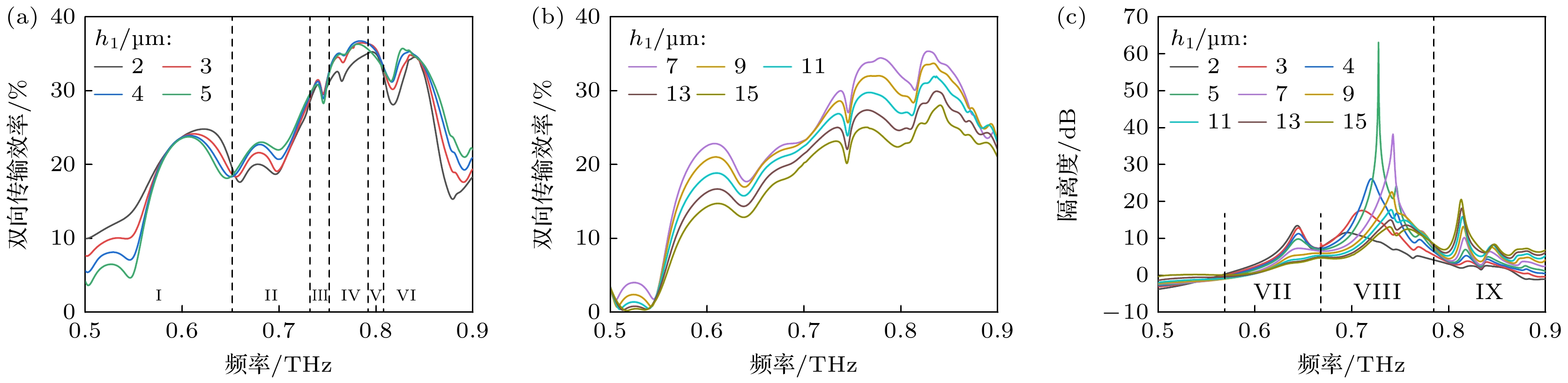 Figure 5. Influence of InSb layer thickness $ {h}_{1} $ on device performance: (a) Variation of bidirectional transmission efficiency at $ {h}_{1} $ ≤ 5 μm; (b) variation of bidirectional transmission efficiency at $ {h}_{1} $ > 5 μm; (c) variation of isolation.