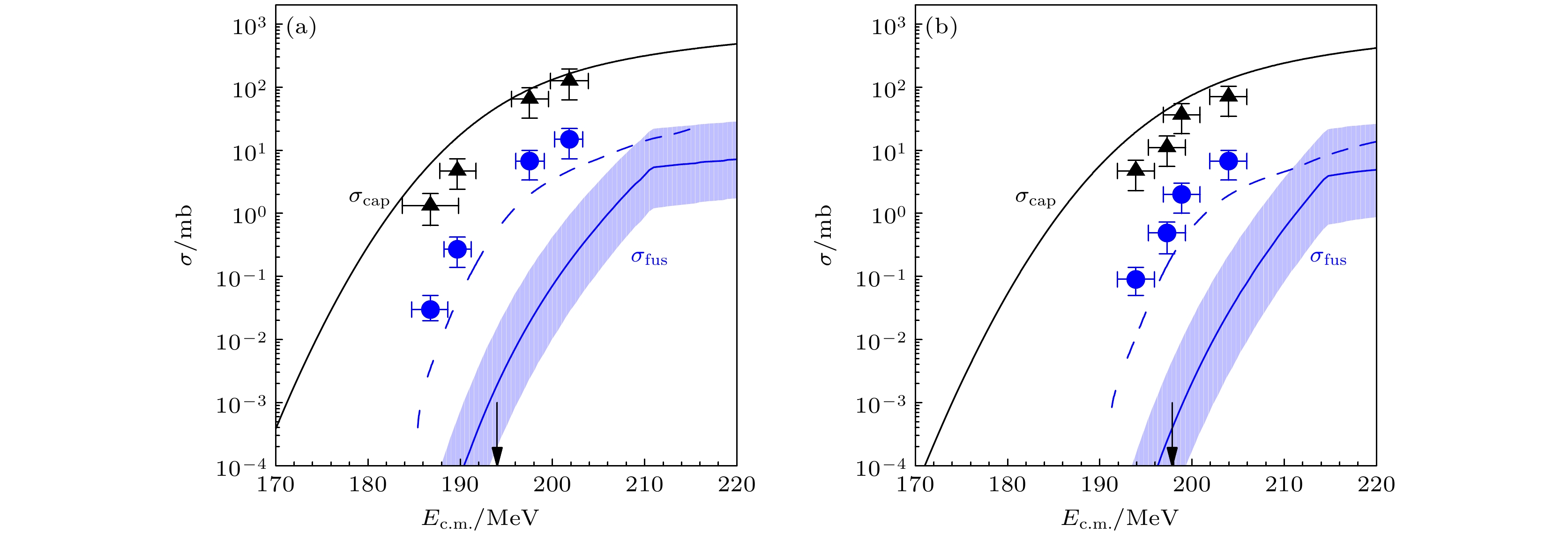 图 4 (a) 基于FBD模型计算的48Ca+244Pu的俘获截面$ \sigma_{\text{cap}} $和熔合截面$ \sigma_{\text{fus}} $; (b) 基于FBD模型计算的48Ca+248Cm的俘获截面$ \sigma_{\text{cap}} $和熔合截面$ \sigma_{\text{fus}} $[83]