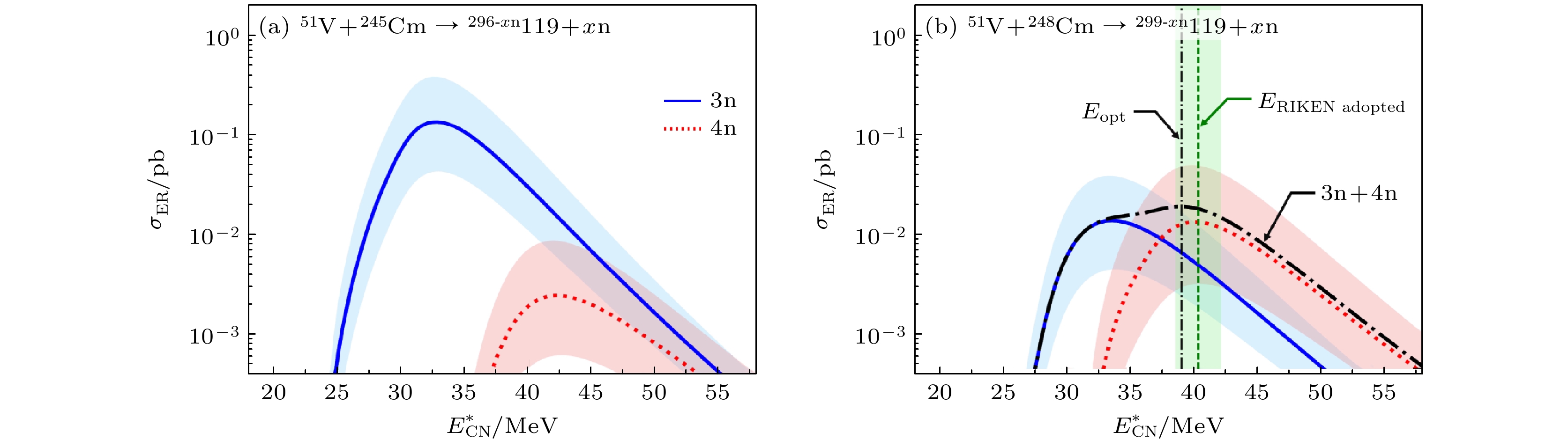 Figure 4. (a) The capture cross sections $ \sigma_{\text{cap}} $ and fusion cross sections $ \sigma_{\text{fus}} $ for the 48Ca+244Pu system calculated by the FBD model; (b) The capture cross sections $ \sigma_{\text{cap}} $ and fusion cross sections $ \sigma_{\text{fus}} $ for the 48Ca+248Cm system calculated by the FBD model[83].
