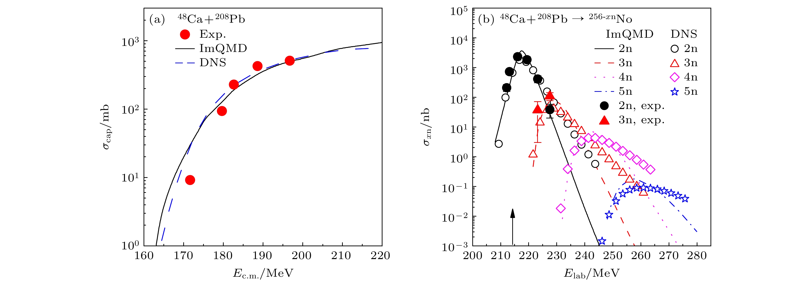 反应体系 $ E_{\text{c.m.}} $(MeV) $ \sigma_{\text{cap}}^{\text{exp}} $[72](mb) $ \sigma_{\text{cap}}^{\text{ECC}} $(mb) $ \sigma_{\text{cap}}^{\text{EBD2}} $[62](mb) $ \sigma_{\text{cap}}^{\text{Wong}} $(mb) $ \sigma_{\text{cap}}^{\text{ImQMD}} $(mb) 48Ca+238U→286Cn 214.7 502 ± 100 375.835 359.819 367.476 562.973 48Ca+244Pu→292Fl 204 126 ± 63 133.976 153.076 160.059 195.093 48Ca+248Cm→296Lv 206 69 ± 35 108.700 120.816 132.157 176.872 48Ti+238U→286Fl 226 250 ± 40 191.874 153.741 197.252 256.668 52Cr+232Th→284Fl 261 410 ± 100 364.361 255.807 344.598 603.500 52Cr+248Cm→300120 251 88 ± 10 145.230 77.347 117.075 146.084 54Cr+248Cm→302120 242 15 ± 3 58.305 36.777 60.473 70.529 64Ni+238U→302120 301 123 ± 37 42.351 139.730 137.971 452.075 -