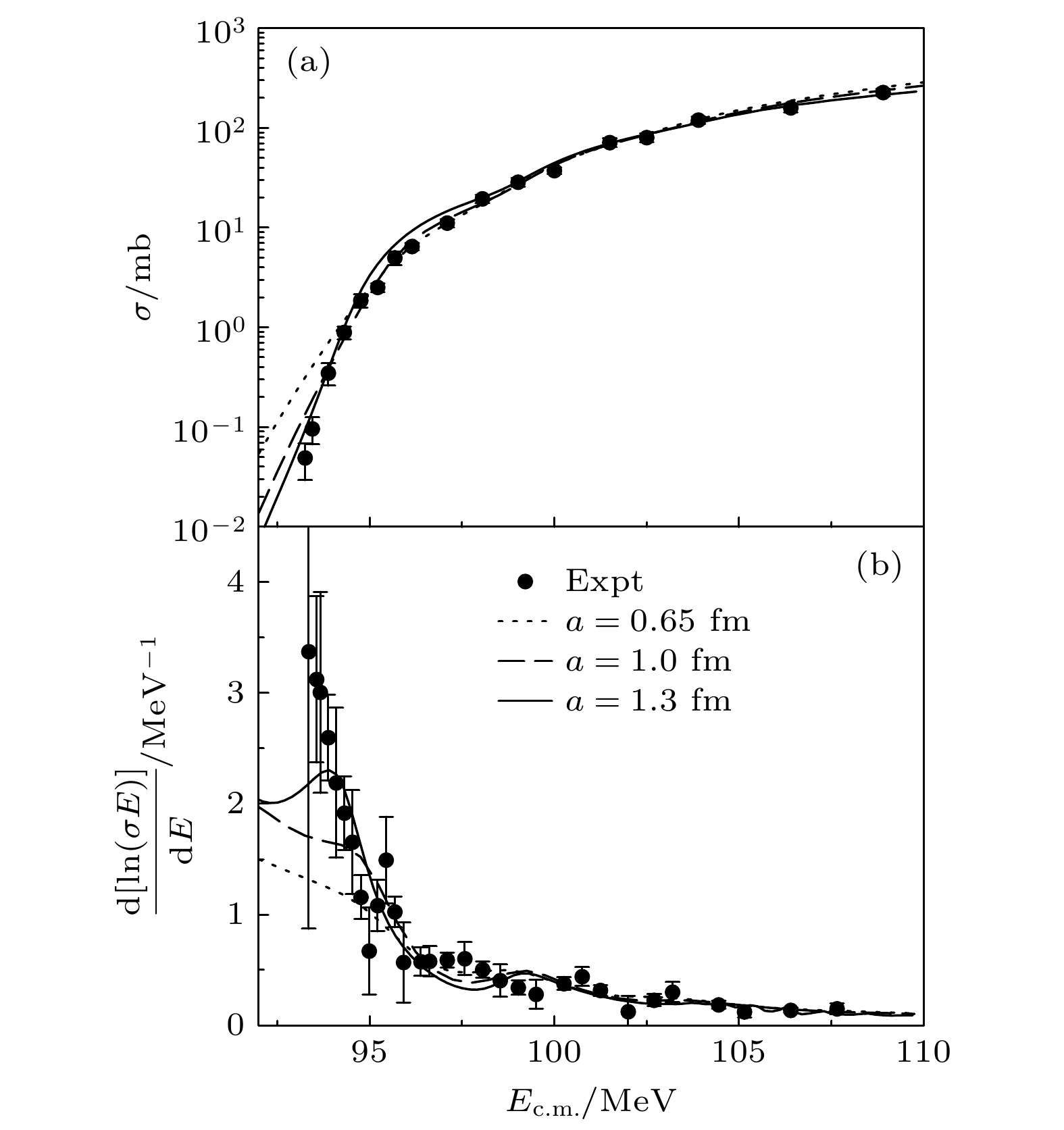 Figure 8. (a) The fusion excitation functions for the $ ^{58}{\rm{Ni}}+^{58}{\rm{Ni}} $ reaction for different surface diffuseness parameters; (b) The logarithmic slopes for the $ {}^{58}{\rm{Ni}}+{}^{58}{\rm{Ni}} $ reaction for different surface diffuseness parameters[121].