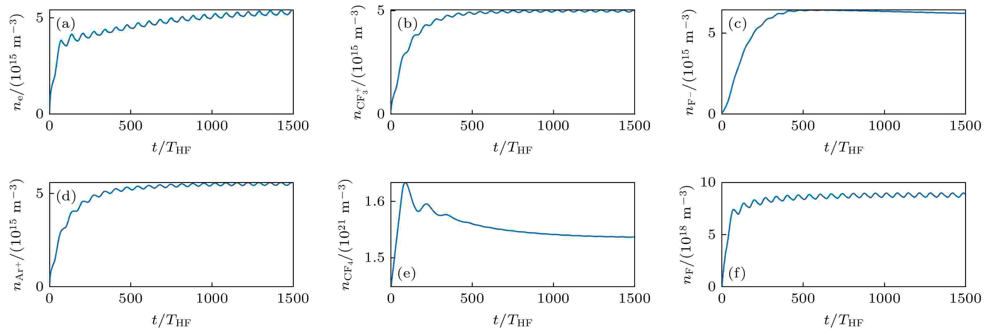 Capacitively coupled plasma sources, which are widely used in the etching and deposition processes of semiconductor manufacturing, have the advantages of simple structure, low cost, and the ability to generate large-area uniform plasma. To meet the requirements of advanced processes, fluid models are usually required to simulate plasma sources and optimize their important plasma parameters, such as density and uniformity. In this work, an independently-developed capacitively coupled plasma fast simulation program is employed to conduct three-dimensional fluid simulations of a dual-frequency capacitively coupled Ar/CF4 plasma source, with the aims of verifying the effectiveness of the program and investigating the influence of discharge parameters such as gas pressure, high and low-frequency voltages, low frequency, and background component ratios. The simulation results show that the program has an extremely high simulation speed. As the low-frequency voltage increases, the plasma density initially remains approximately constant and then significantly increases, while the plasma uniformity initially rises and then significantly decreases. In this process, the γ-mode heating of the low-frequency source increases and becomes the dominant mode in replace of the α-mode of high-frequency source. As the lower frequency increases, plasma density initially remains approximately constant and then slightly increases, while the plasma uniformity does not change much. this is because the γ-mode heating is frequency independent, while the α-mode heating is much lower than high-frequency source. As the high-frequency voltage increases, the plasma density significantly increases, while the plasma uniformity initially rises and then significantly decreases, the α-mode heating of high-frequency source is significantly enhanced in this process. As the pressure increases, the plasma density significantly increases, and the plasma uniformity also rises significantly, the reason is the more complete collision between particles and background gases. As the Ar ratio in background gases increases, the plasma density changes slightly, the density of Ar-related particles generally increases and the density of CF4-related particles generally decreases, although there are some non-monotonic changes in particle densities, which reflects the mutual promotion between some ionization and dissociation reactions.