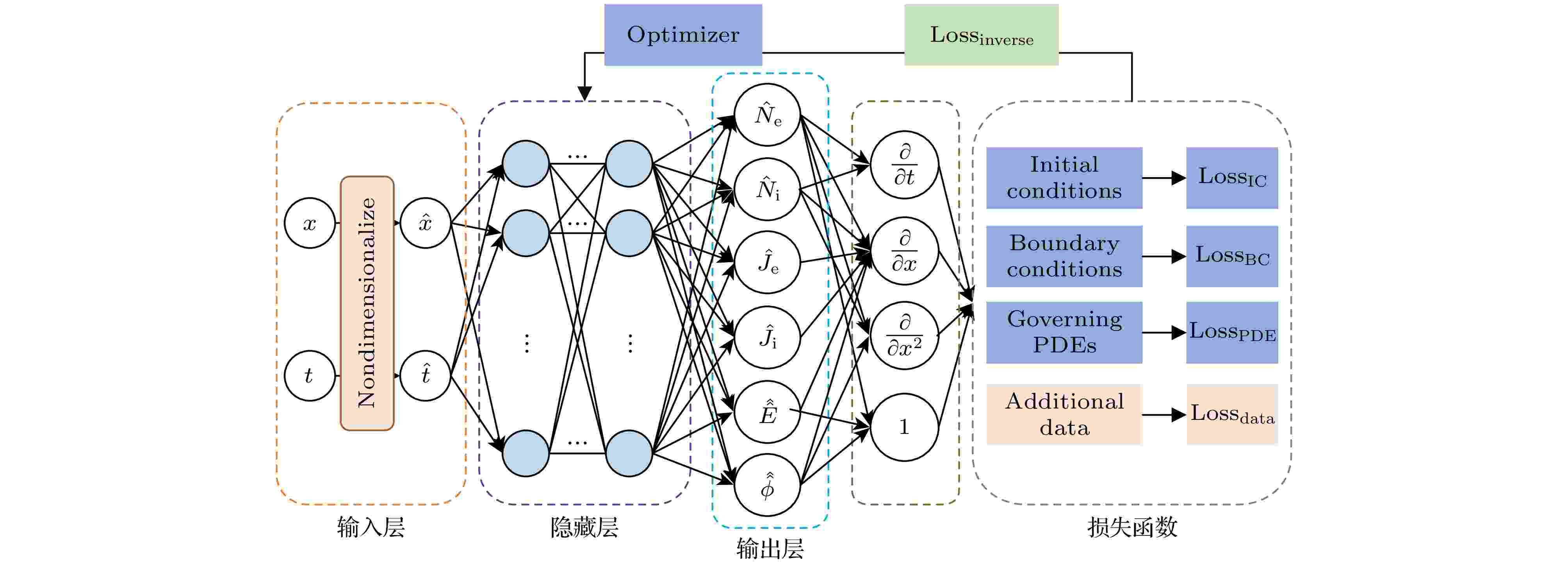The inverse problem of low-temperature plasmas refers to determining discharge parameters such as voltage amplitude and frequency from plasma characteristics, including plasma density, electric field and electron temperature. Within the framework of fluid description, it is usually very challenging to address inverse problems by using traditional discretization methods. In this work, physics-informed neural networks (PINNs) are introduced to solve the inverse problem of atmospheric-pressure radio-frequency plasmas. The loss function of the PINNs is constructed by embedding three components: the main governing equations (continuity equation, Poisson equation, and drift–diffusion approximation), the discharge parameters to be inferred (voltage amplitude and frequency in this study), and additional electric field data. The well-trained PINNs can accurately recover the discharge parameters with errors within about 1%, while providing the full spatiotemporal evolution of plasma density, electric field, and flux. Furthermore, the effects of sampling positions, sampling sizes, and noise levels of the electric field data on the inversion accuracy of voltage amplitude and frequency are systematically investigated. The results demonstrate that PINNs are capable of achieving precise inversions of discharge parameters and accurate prediction of plasma characteristics under given experimental or computational data, thereby laying a foundation for the intelligent control of low-temperature plasmas.