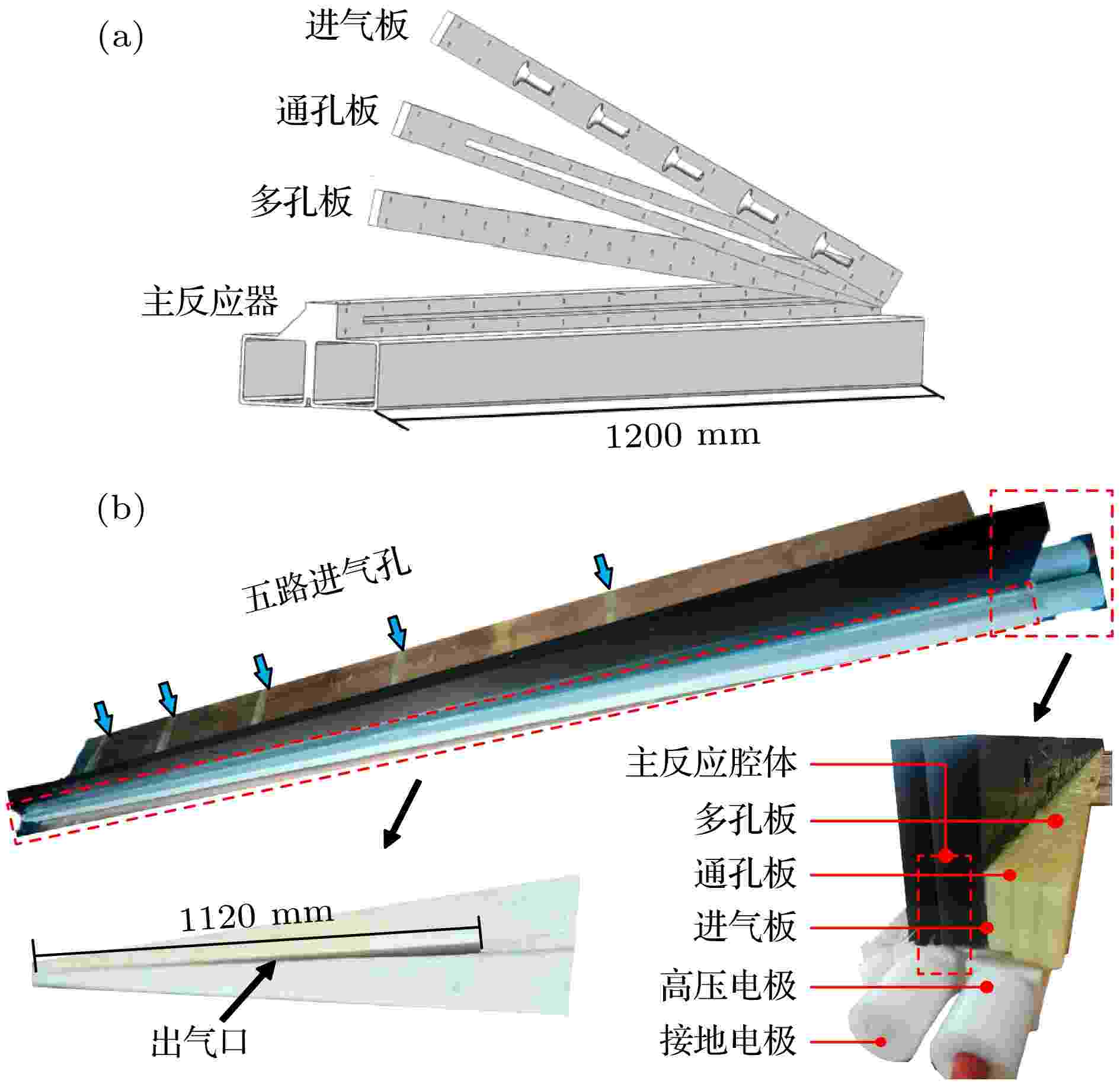 A meter-scale wide indirect dielectric barrier discharge (DBD) for treating large-scale and irregular-shaped materials is reported in this study. The structure of the modular-graded gas path is designed, and the influence of gas hole density on the flow field is simulated. It is confirmed that 8 subdividing (40 holes uniformly distributed) structure can effectively improve the uniformity of the gas flow rate distribution in the discharge area and on the treated material surface compared with 0 subdividing structure. Based on this structure, Ar is employed as the discharge gas and hexamethyldisilane as the precursor to generate meter-scale wide plasma under the excitation of a nanosecond pulsed power supply. Particle activity, discharge uniformity and stability under different operating parameters are evaluated by measuring voltage-current waveforms, emission spectra, luminescence images and temperatures at different electrode positions. The treatment effect and uniformity are verified by measuring the water contact angle (WCA) of epoxy (EP) material. The results show that a uniform and stable plasma with a width of 1120 mm is generated under suitable operating parameters. By increasing the voltage amplitude, both the discharge intensity and particle activity are improved, while the discharge uniformity and stability are significantly reduced. By increasing the discharge gas flow rate, the particle activity, discharge uniformity, and stability can be improved simultaneously but slightly. The WCA on the EP surface is uniformly increased from 67° to 144° with a variation of less than 6% after 10-min treatment at a voltage amplitude of 12 kV and a discharge gas flow rate of 10 L/min. The meter-scale wide indirect DBD electrode in this work can provide reference and basis for the industrial application of large-scale plasma material modification technology.