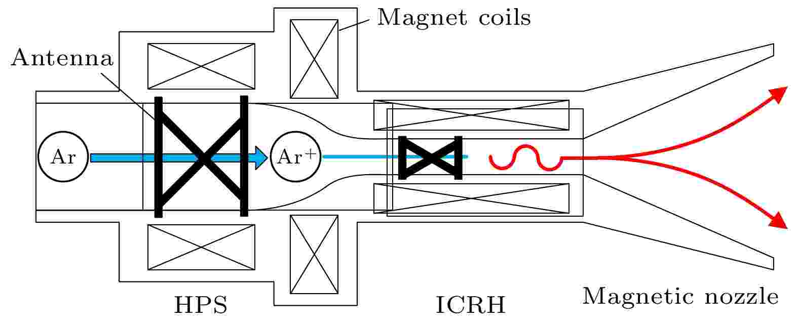 With the technological advantages of high thrust, high specific impulse, long life, variable specific impulse, and high efficiency, the variable specific impulse magnetoplasma rocket engine has become the essential advanced propulsion system for the deep space exploration and manned space flight in the future. In the variable specific impulse magnetoplasma rocket engine, the ion cyclotron resonance heating stage is linked with the helicon plasma source. The operation status of the helicon plasma source has a direct influence on the ion heating process in the ion cyclotron resonance heating stage. It is of great significance for the testing and the optimization of the engine performance to reveal the influence of the ionization process on the ion heating process. In this paper, a multi-fluid model in which the ion cyclotron resonance heating stage is linked with the helicon plasma source is developed. The numerical simulations with different input currents of helicon plasma source and different pressures are performed to analyze the effect of the operation status in the helicon plasma source on the ion energy density in the ion cyclotron resonance heating stage. The results show that the discharge mode of the helicon plasma source gradually changes with the increase of the input current and that the plasma density jump appears while the ion temperature remains basically unchanged. With the plasma density jump and nearly identical ion temperature the ion energy density jump also appears in the simulation domain. Similar to the results of the simulation under different input currents of the helicon plasma source, the plasma density and the ion energy density also jump when the pressure increases. However, the ion temperature decreases due to the discrepancy between the input frequency and the resonance frequency. With the numerical model and the input conditions of this study, the ionization process in the helicon plasma source is decoupled with the ion heating process in the ion cyclotron resonance heating stage. The energy gain of a single ion in the ion cyclotron resonance heating stage does not change with the operation status of the helicon plasma source, thereby accounting for the ability of the engine to work in multi mode.