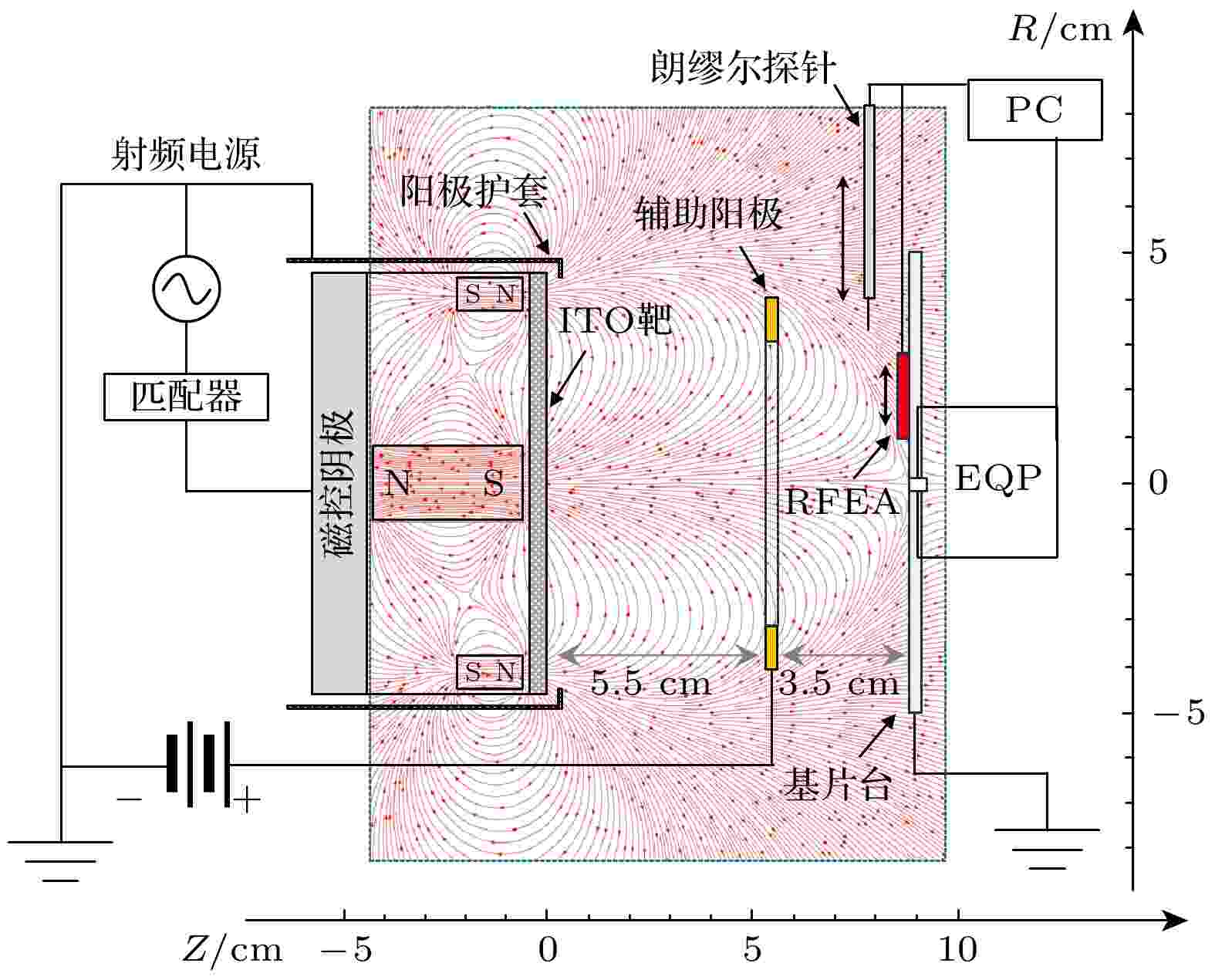 Understanding the dynamics of ions in the magnetron sputtering process of transparent conductive oxide (TCO) films is essential for clarifying the mechanisms of sputtering-induced damage and developing effective suppression strategies. In this work, indium tin oxide (ITO) is used as a cathode target in an RF magnetron sputtering system operating under pure argon atmosphere, and a positively biased auxiliary anode is introduced to modulate the plasma potential and investigate its effect on the ion energy distribution functions (IEDFs) at the substrate position. The ion energy spectra are measured using a commercial energy–mass spectrometer (EQP 1000, Hiden), and the plasma parameters such as potential and electron density are characterized using a radio-frequency compensated Langmuir probe. The results show that the incident positive ions consist mainly of O+, Ar+, In+, Sn+, as well as multiple metal oxide molecular and doubly charged ions. Their energies are determined by the combined effects of the initial ejection or backscattering energy of sputtered particles and the plasma potential. Increasing the auxiliary anode bias leads to an elevation of the plasma potential, thereby enhancing both the kinetic energy and flux of positive ions. In contrast, negative ions such as O– and $\rm O_2^-$ originate predominantly from cathode sputtering, exhibiting broad, multi-peaked energy distributions that are strongly influenced by RF oscillations of the cathode voltage and plasma potential, as well as relaxation effects during ion transport. Heavier metal oxide negative ions ($\rm InO^-, \;InO_2^-,\; SnO^-,\; SnO_2^-$) respond more slowly to RF sheath modulation, with their high-energy peaks converging toward the cathode bias potential. Applying a positive auxiliary anode bias effectively reduces the cathode bias voltage, thereby suppressing the high-energy tail of negative ions without significantly affecting their total energy-integrated intensity. This demonstrates that auxiliary anode biasing provides an effective means for adjusting the ion energy distributions in magnetron sputtering discharges. The proposed approach provides a potential pathway for mitigating sputtering-induced damage and improving the structural and electronic quality of ITO films. Future work will focus on correlating the measured ion energy modulation with comprehensive film characterizations—including optical, electrical, and interfacial analyses—to further verify the physical mechanisms and evaluate the practical effectiveness of damage suppression during TCO deposition.