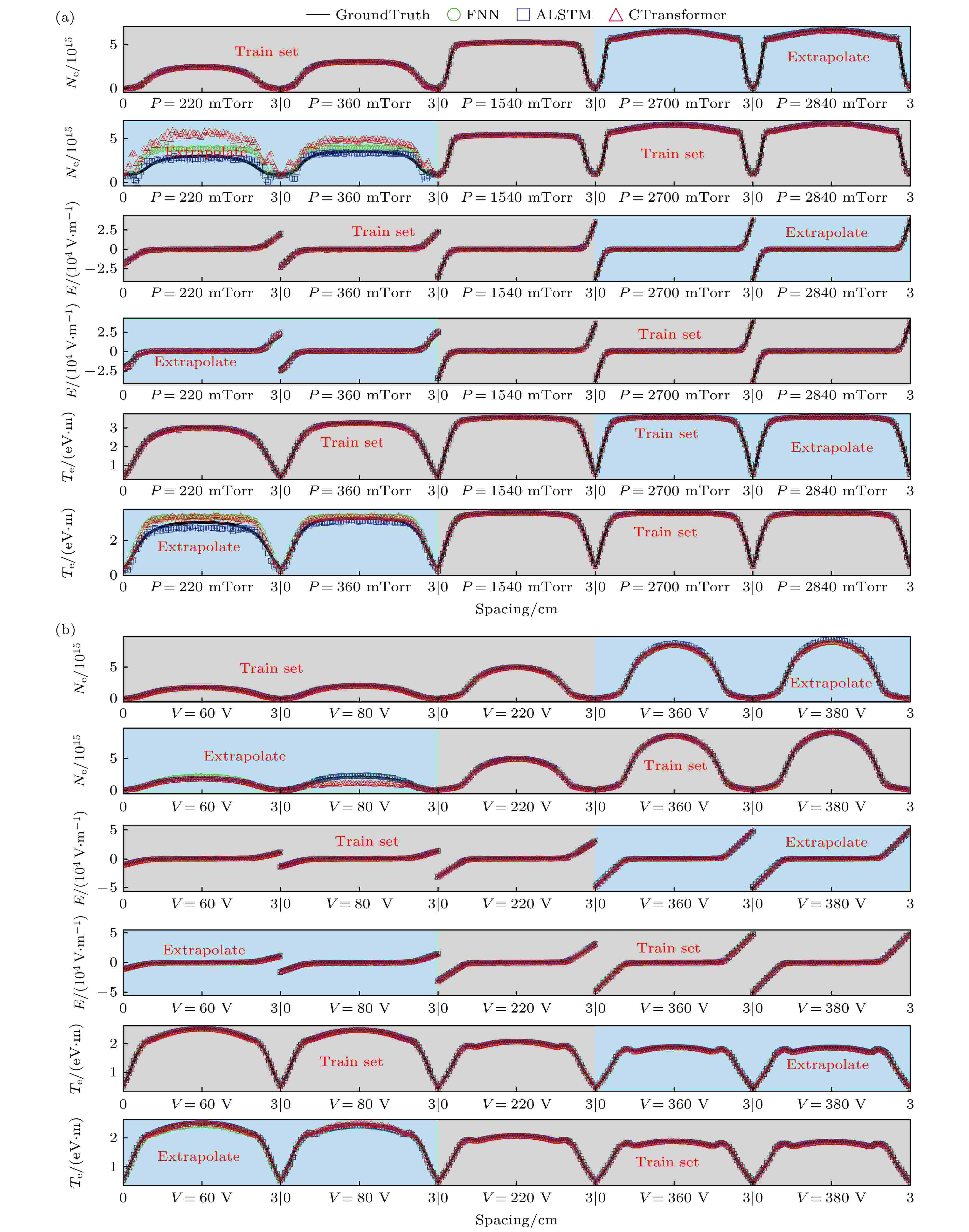 Fluid simulations of capacitively coupled plasmas (CCPs) are crucial for understanding their discharge physics, yet the high computational cost results in a major bottleneck. To overcome this limitation, we develop a deep learning-based surrogate model to replicate the output of a one-dimensional CCP fluid model with near-instantaneous inference speed. Through a systematic evaluation of three architectures, i.e. feedforward neural network (FNN), attention-enhanced long short-term memory network (ALSTM), and convolutional-transformer hybrid network (CTransformer) it is found that the sequence-structured ALSTM model can achieve the optimal balance between speed and accuracy, with an overall prediction error of only 1.73% for electron density, electric field, and electron temperature in argon discharge. This study not only achieves significant simulation acceleration but also reveals that the model can accurately extrapolate from low-pressure conditions dominated by complex non-local effects to high-pressure conditions governed by simple local behavior, whereas the reverse extrapolation fails. This finding suggests that training under low-pressure conditions enables the model to capture more comprehensive physical features. From the perspective of model weights, both low-pressure and high-pressure models assign important weights to the sheath region. However, the low-pressure model exhibits higher weight peaks in the sheath, indicating stronger ability to capture the essential physics of sheath dynamics. In contrast, the high-pressure model, because of its lower weighting in the sheath region, may fail to adequately resolve complex sheath dynamics when predicting under new operating conditions, thereby limiting its extrapolation capability with high fidelity. To ensure the reliability of this data-driven model in practical applications, we establish a trust boundary with a normalized mean absolute spatial error of 5% for model performance through systematic extrapolation experiments. When the model's extrapolation error falls below this threshold, the spatial distribution curves of predicted parameters such as electron density and electron temperature closely match the true physical distributions. However, once the error exceeds this critical point, systematic deviations such as morphological distortion and amplitude discrepancies begin to appear in the predicted spatial distributions, significantly deviating from the true physical laws. In the future, we will develop neural network models capable of processing high-dimensional spatial data and combining multi-dimensional input features such as various discharge gases, ultimately realizing a dedicated AI model for the field of capacitively coupled plasmas.