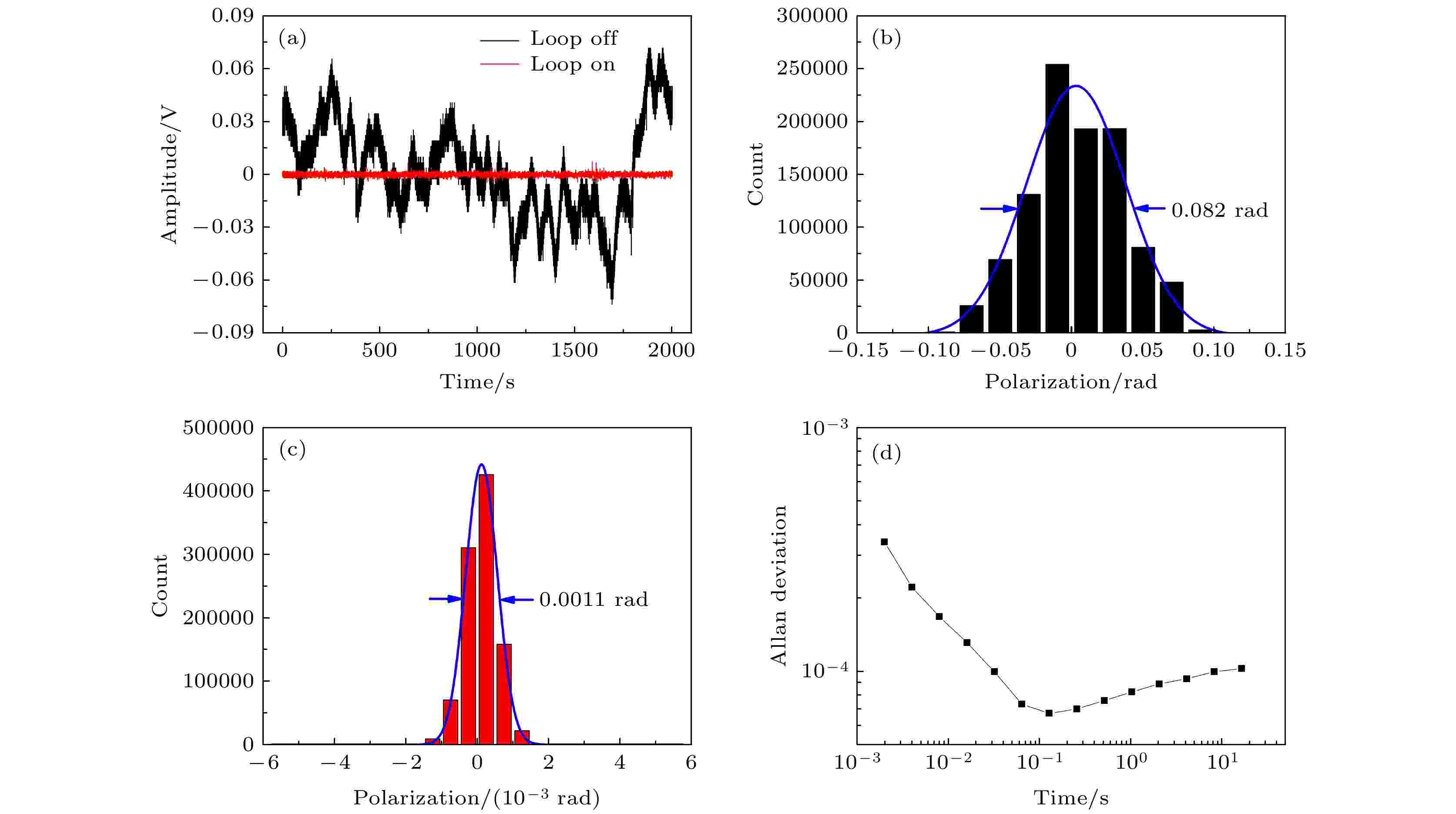 The key security of quantum key distribution (QKD) is guaranteed by the basic principle of quantum mechanics, which makes it possible to combine information theory security communication with one-time encryption. The key is usually encoded on the polarization dimension or phase dimension of a single-photon. It is considered that the birefringence effect of single-mode fiber leads to a random variation of polarization state, which would induce the bit error rate. So it is of great significance to keep the single-photon linear polarization state stable for both polarization encoding QKD system and phase encoding QKD system. By using the single-photon polarization modulation technology, the single-photon linear polarization state periodically varies with the external modulation signal. The flicker noise is suppressed effectively, and the signal-to-noise ratio (SNR) of single-photon counting is increased as indicated by the phase-sensitive detection with a lock-in amplifier (LIA). The error signal is generated by demodulating the modulated single photons and it is used to lock an arbitrary 1550 nm single-photon linear polarization state to the optical axis of in-line polarizer (ILP). The modulation frequency reaches up to 5 kHz, which can eliminate the influence of low frequency flicker noise. The LIA demodulates the single-photon pulses by using 78.1 Hz filter bandwidth, with a time constant of 1 ms and a filter slope of 24 dB. The SNR of error signal is 20. The zero-crossing point of error signal represents the single photon’s linear polarization state aligned to the optical axis of ILP. The linear slope around the zero-crossing point for the polarization state angle versus the error signal amplitude is 1.267 rad/V. When the negative feedback loop does not work, the polarization drift of single-photon pulses is 0.082 rad due to the random environmental noise. However, by using the single-photon polarization modulation technology, the polarization drift of stable single-photon pulses is limited to 0.0011 rad within 2000 s through the precise control with a polarization rotator, and the corresponding Allan deviation reaches the minimal value of 6.7×10–5 at an integration time of 128 ms. The advantages for the single-photon polarization modulation technology are as follows: i) the linear polarization state drift is compensated in real-time at the single-photon level; ii) single frequency polarization modulation can be extended to multiple frequency polarization modulation in order to achieve simultaneous locking of multiple linear polarization states of single-photon pulses; iii) these 1550 nm single-photon pulses with the 0.0011 rad linear polarization state stability can be directly used as the single-photon source in either polarization encoding or phase encoding QKD system.