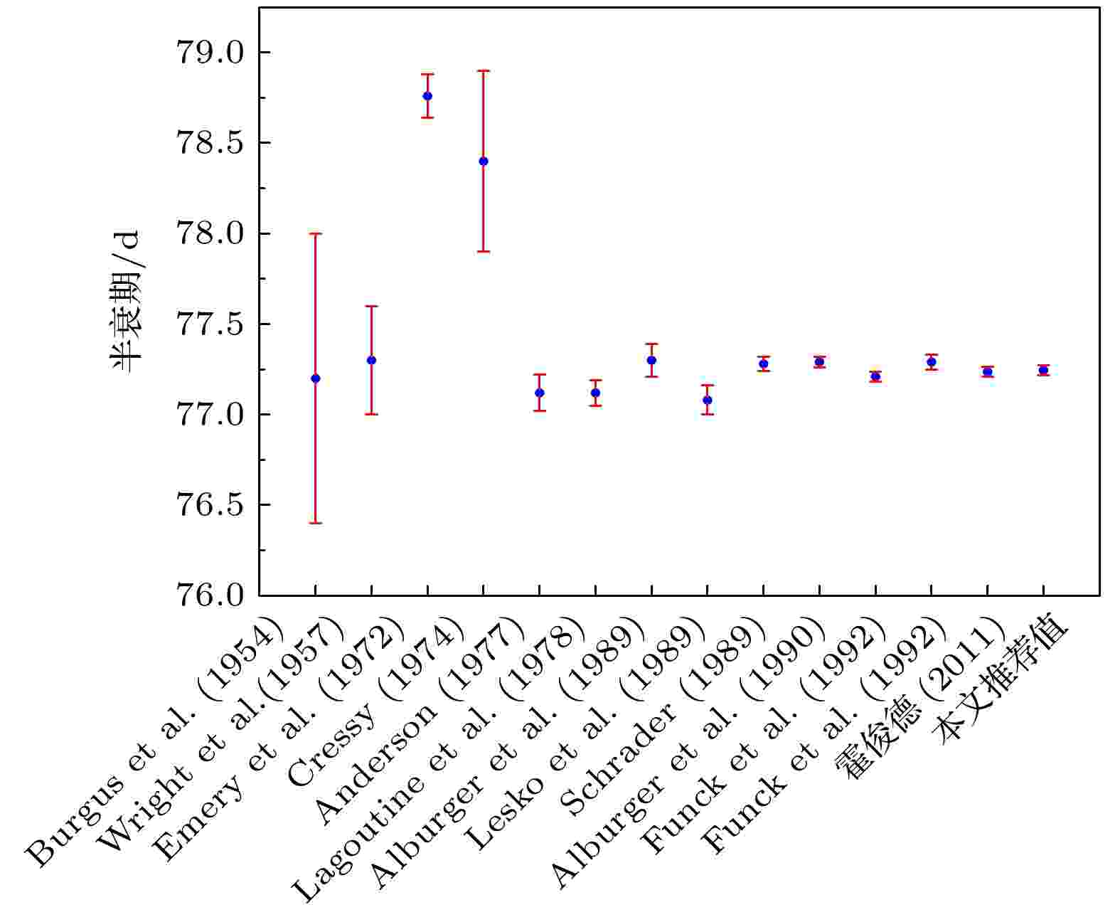56Co衰变释放的γ射线能量范围为0.84—3.55 MeV, 其衰变数据是探测器效率刻度的重要依据. 早期针对56Co γ相对强度测量数据在Eγ > 2.5 MeV的高能区存在系统性偏差. 针对此问题, 本研究基于核科学参考文献库(Nuclear Science References, NSR)中的实验测量数据, 重点综合了2000年后的5项高精度实验测量结果, 对半衰期及γ发射几率等关键衰变数据进行系统分析, 给出了一套可用于探测器效率刻度的56Co衰变推荐数据. 在高能区段, 本工作所给出结果低于ENSDF现有评价数据约2%. 该推荐数据适用于高能伽马探测器的效率刻度, 可为Eγ > 2.5 MeV能区提供更准确的参考依据. 本文数据集可在科学数据银行数据库https://doi.org/10.57760/sciencedb.j00213.00169 中访问获取.